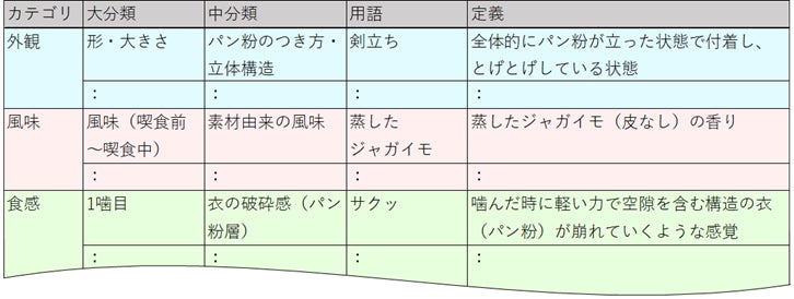 体系を開発しました。市場に流通しているコロッケの特徴を網羅するように調製した50種類のモデルコロッケについて、16名の熟練した評価者が感じた特徴を言葉で表しました。これにより外観/喫食前の香り/喫食中の風味/食感について約600語の表現を収集しました。これらの表現について整理、統合、分類し、各用語に定義を付け、最終的に75語からなるコロッケの官能評価用語体系を構築しました(図2)。