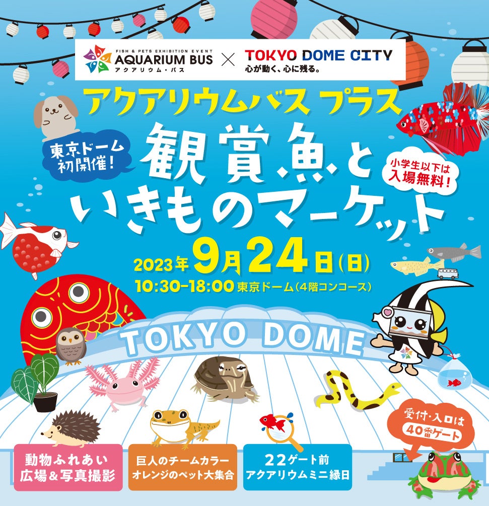 国内最大級の生き物イベント「アクアリウムバス」のスペシャルイベントを、東京ドームにて初開催します。観賞魚をはじめ、爬虫類・両生類・小動物・植物・昆虫・飼育グッズ・ハンドメイドグッズなど、様々な生き物関連のお店が東京ドームに大集合します。また、イースタン・リーグ巨人戦にちなんで、「巨人のチームカラー オレンジのペット大集合」のコーナーなど、楽しい展示コーナーも登場します。