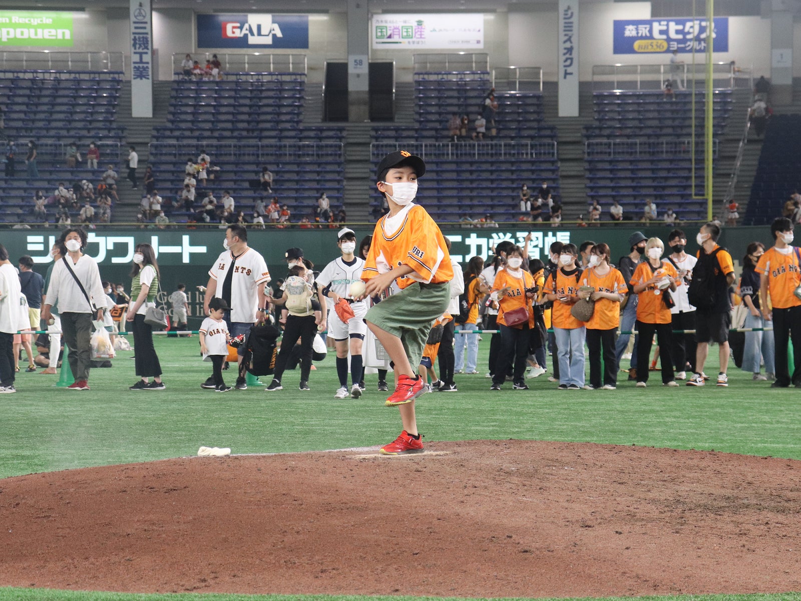 試合後のピッチャーマウンドで、1人1球の投球体験を行います。熱戦の冷めやらぬ場所で、実際にピッチングをすることができる貴重な体験です。