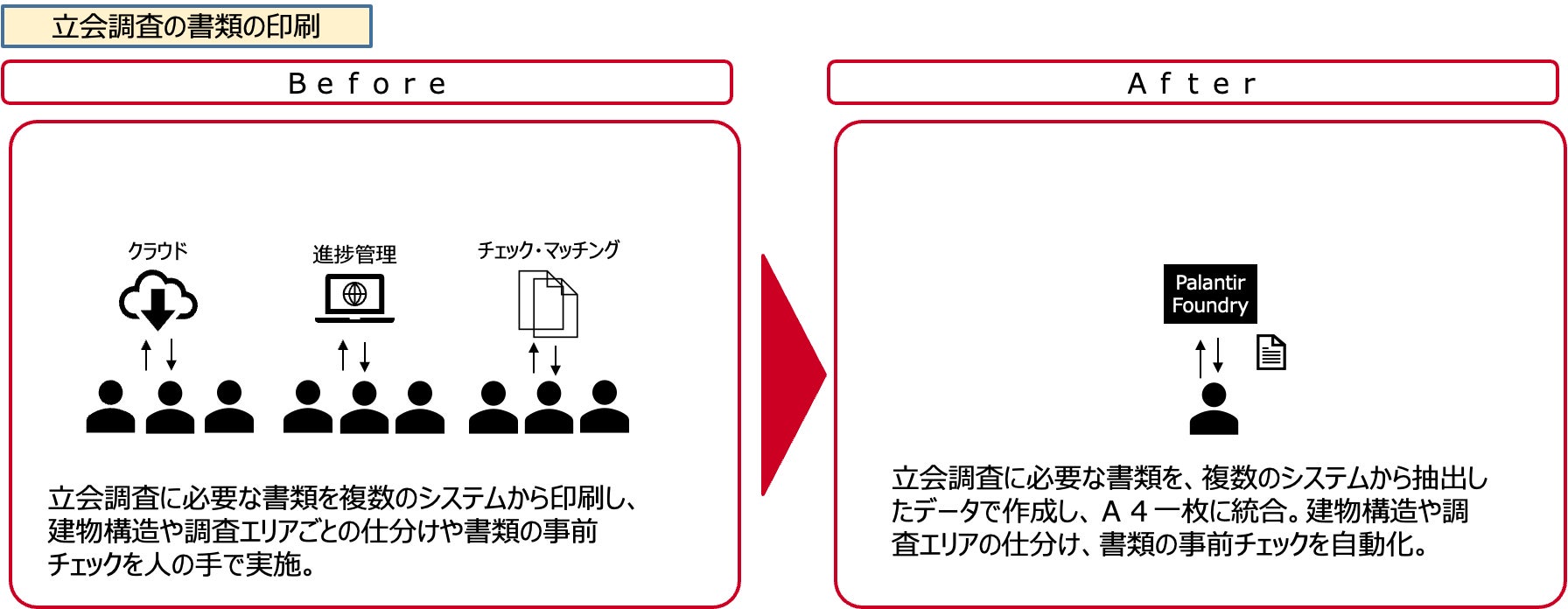 今回、PalantirのプラットフォームであるFoundryを活用して、これらの散在するデータを1箇所に収集・統合し業務プロセスに合わせて再構築することで業務を効率化するアプリケーション(以下「本アプリケーション」)を約2週間という期間で開発し、4月末から約2か月間にわたって宮城県の災害対策本部で実用性を検証するトライアル(以下「本トライアル」)を実施しました。業務オペレーションの大幅な改善により、約2か月間の本トライアルで全体の約21%の事務の効率化を実現しました。これにより、お客さまの保険金の受け取りが3~4日早くなると見込まれます。