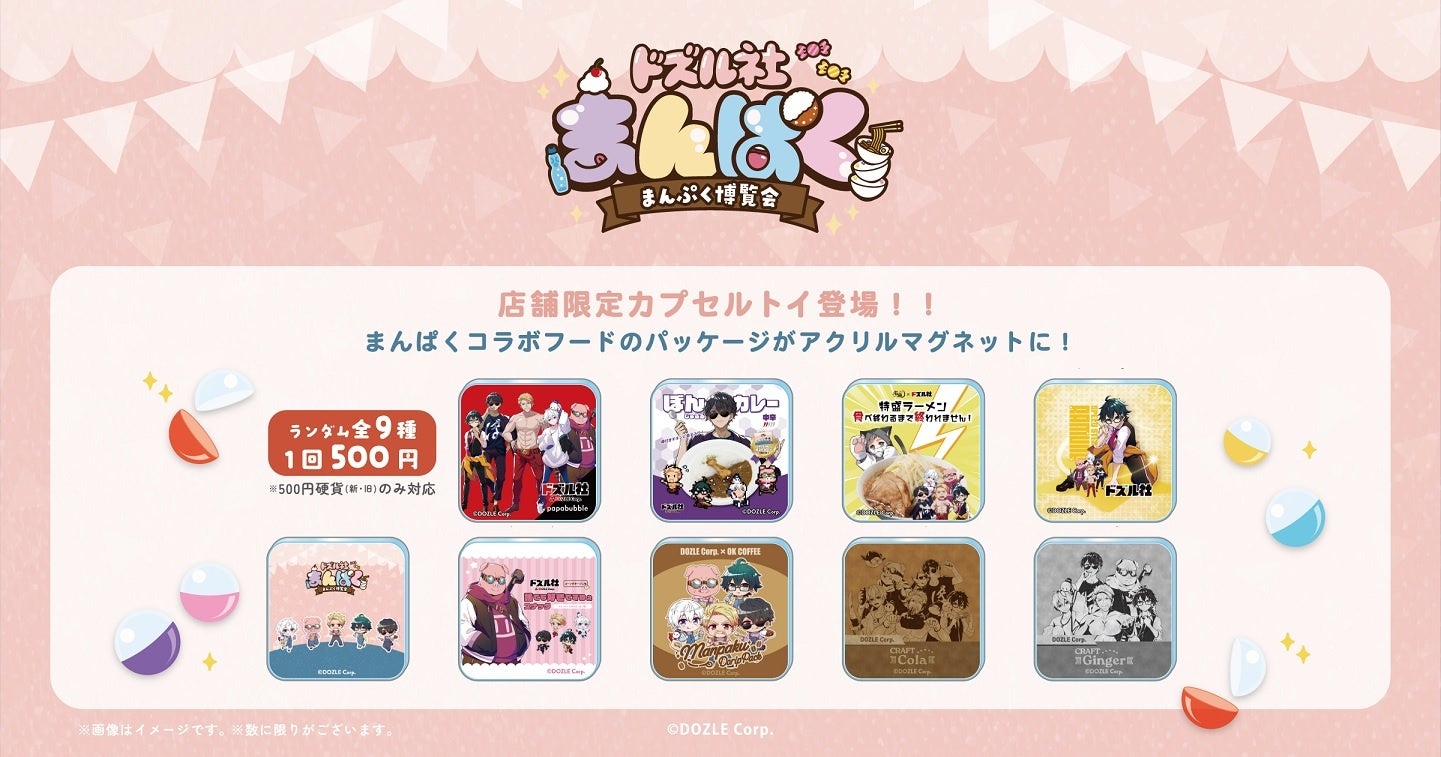 各まんぱくコラボ商品のパッケージデザインがアクリルマグネットになったカプセルトイも登場します。