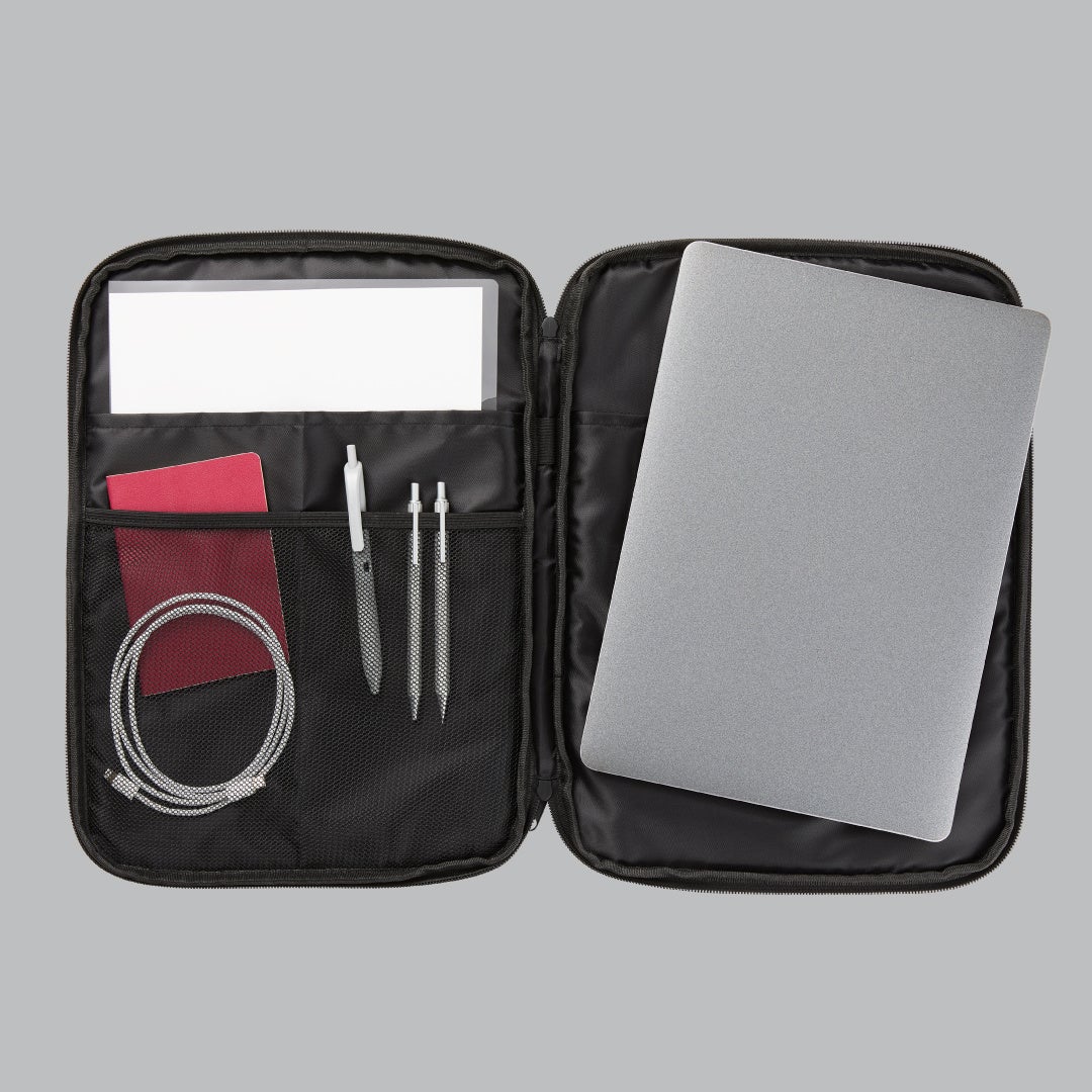 黒ねこA4マルチケースは、A4サイズのクリアファイルに加え、13~14インチのノートPCが収納可能です(*1)。内側は中身が見やすいメッシュ仕様で、書類やPC周辺アイテムをすっきり整理できます。