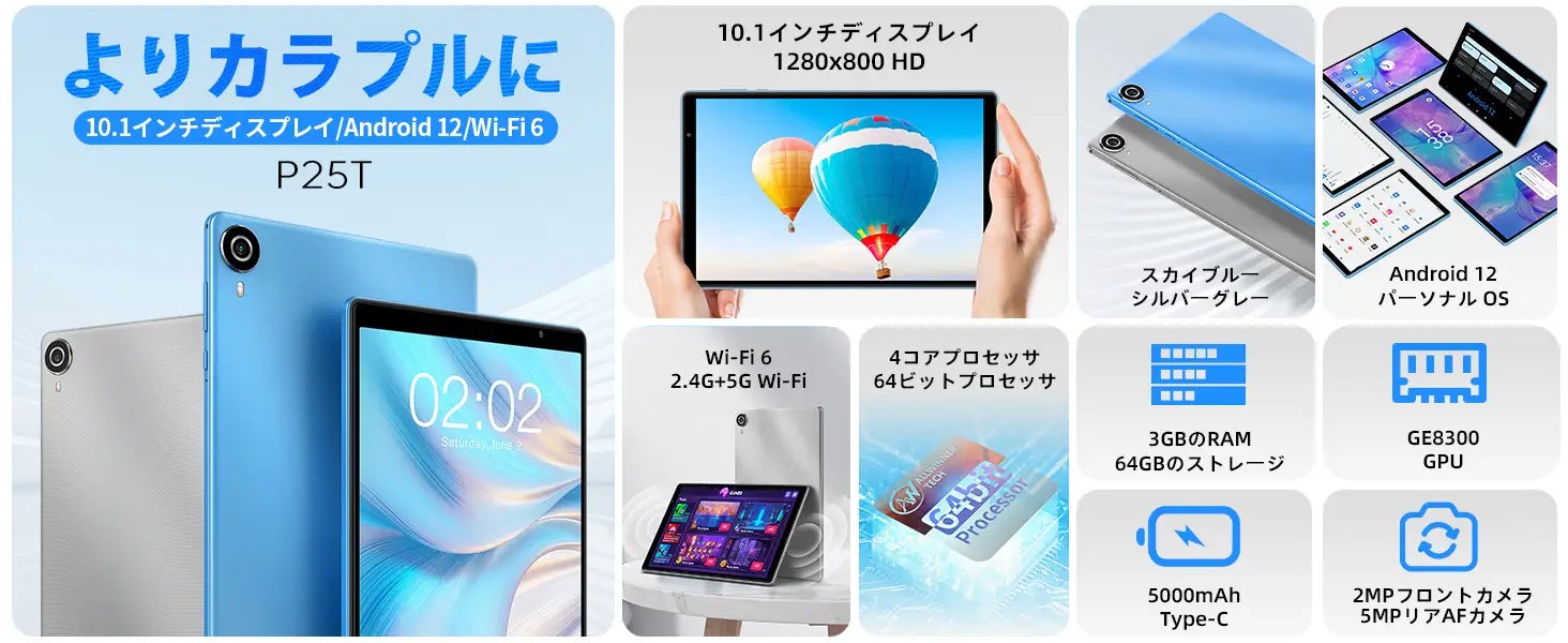 1280x800 HD解像度の10.1インチIPS 178°ワイドビューアングルディスプレイが搭載されているため、ゲームやビデオで優れたビジュアル体験が得られます。「P25T」は、Wi-Fi5より高速で大容量で低遅延の超高速Wi-Fi 6をサポートしています。エネルギー効率の高いBluetooth対応5.0により、ワイヤレスヘッドフォンで優れたオーディオを楽しむことができます。