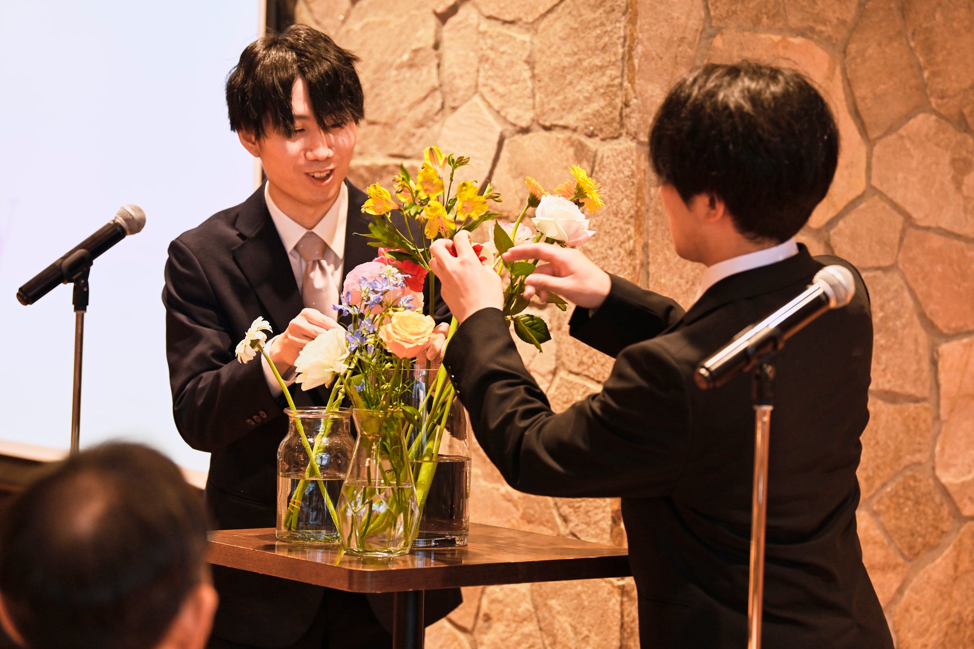 新入社員からは「自らの存在で、一緒に働くチームを明るくさせられるような魅力を持った社会人になりたいという想いから、「晴れやかな魅力」という花言葉を持つラナンキュラスを選んだ」や「社会人生活がスタートし、今後壁にぶつかることもあると思うが、白のガーベラの花言葉「希望・前進」に表されるように、自分らしく希望をもって前進していきたい。そして花の色のように真っ白な気持ちでさまざまなことを吸収していきたい」といった抱負が述べられました。