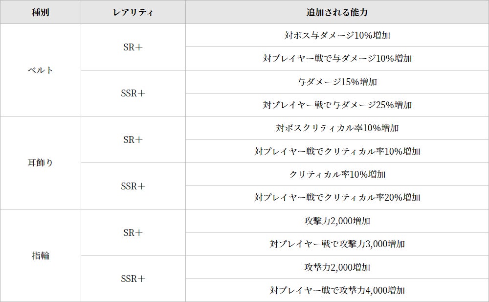 ・「SSR+装飾品」「SR+装飾品」は、それぞれ既存の「SSR/SR装飾品」より高い性能を持つ装備です。