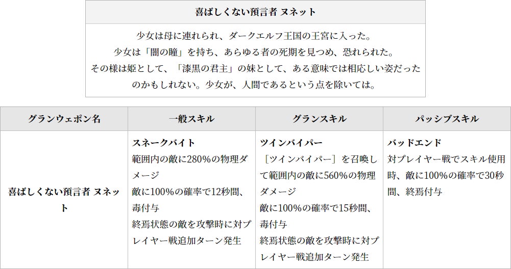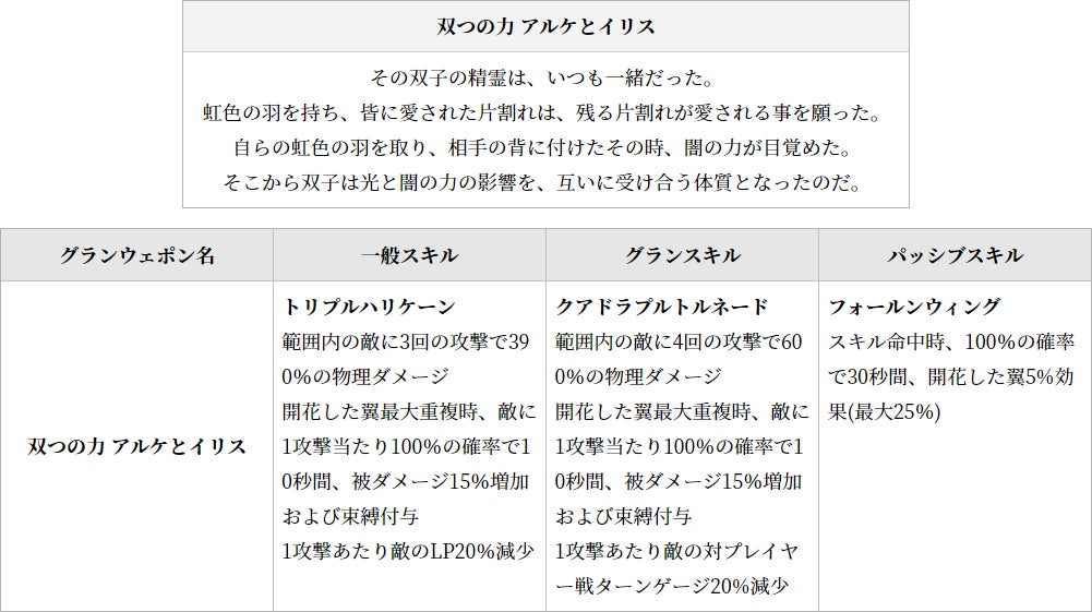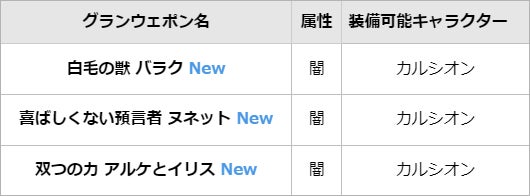 ・[ 図鑑 > グランウェポン ]に、「白毛の獣 バラク」「喜ばしくない預言者 ヌネット」「双つの力 アルケとイリス」が追加されます。