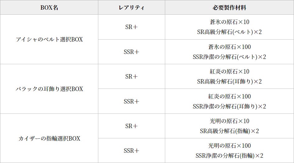 ・「SSR+装飾品」「SR+装飾品」は、「SSR上級討伐指令書」「SR上級討伐指令書」から獲得できるアイテムと、既存の「SSR/SR装飾品」を分解することで獲得できるアイテムを使用して製作可能です。