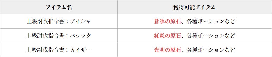 ・新たに「上級討伐指令書:アイシャ」「上級討伐指令書:バラック」「上級討伐指令書:カイザー」が追加されます。