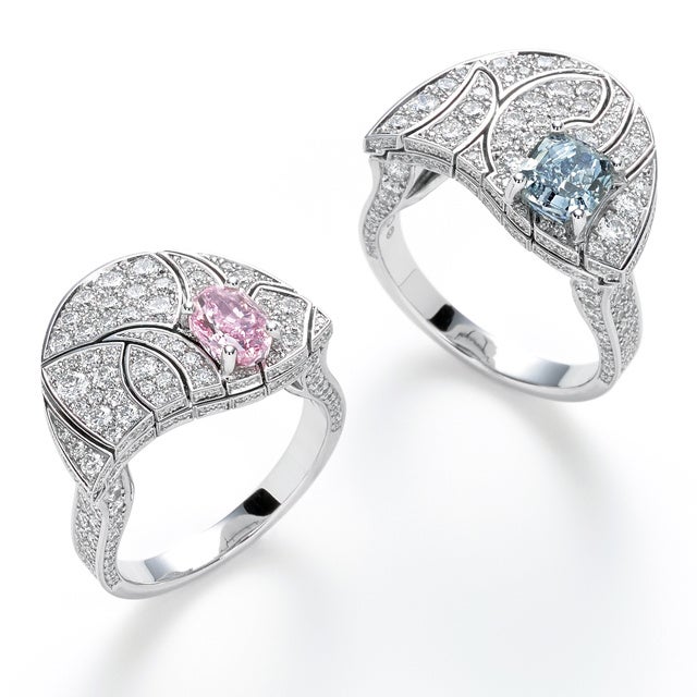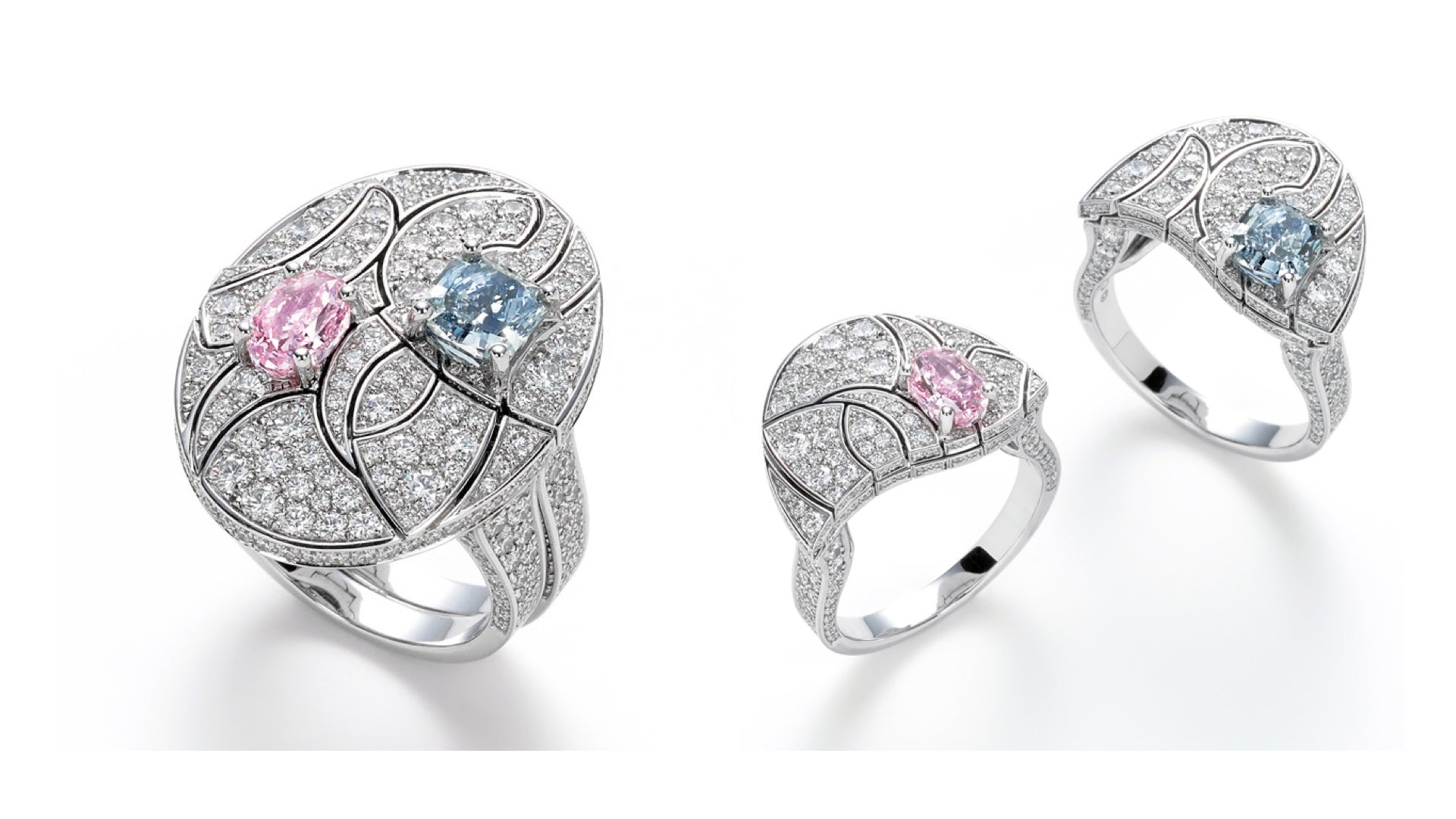 使用されているビビッドブルーダイヤモンドとビビッドピンクダイヤモンドは、40個のダイヤモンドの中から選び抜かれた最高グレードの2個です。また、このリングは2つに分けて使用することもできる特別な設計となっています。当社のジュエリーオークションにおいて、これまでに出品された中で最高の商品であり、その希少性と価値は他に類を見ない逸品です。