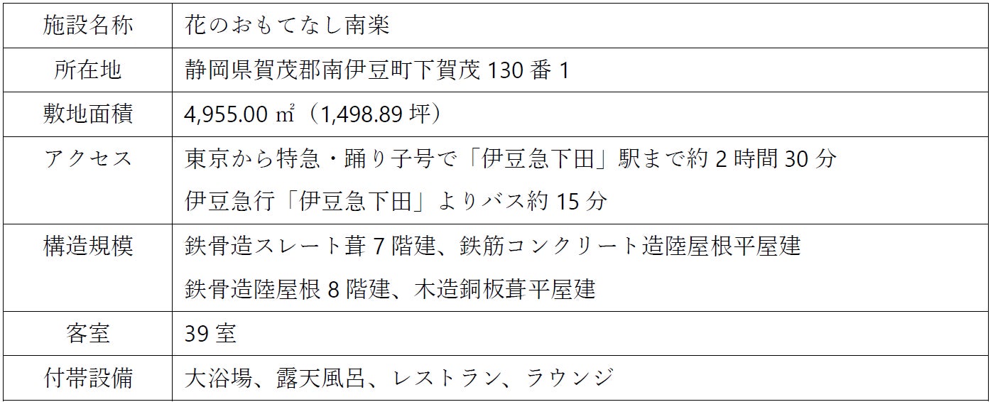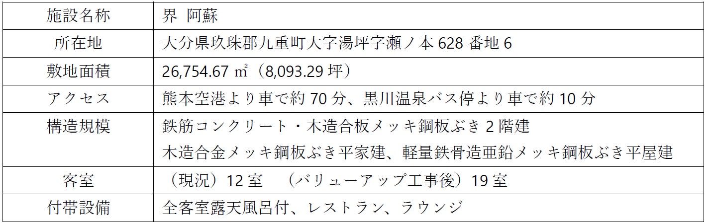 株式会社NBIホールディングス(本社:東京都港区、代表取締役:金谷 隆行、以下「NBIホールディングス」)が推進する、阿蘇黒川温泉プロジェクト(以下「阿蘇黒川温泉PJ」)および伊豆下田南楽プロジェクト(以下「伊豆下田南楽PJ」)へ、三井住友ファイナンス&リース株式会社(本社:東京都千代田区、代表取締役社長:今枝 哲郎)の戦略子会社であるSMFLみらいパートナーズ株式会社(本社:東京都千代田区、代表取締役社長:上田 明、以下「SMFLみらいパートナーズ」)が参画したこと、並びに開業に向けた施設のバリューアップ工事を開始することをお知らせいたします。