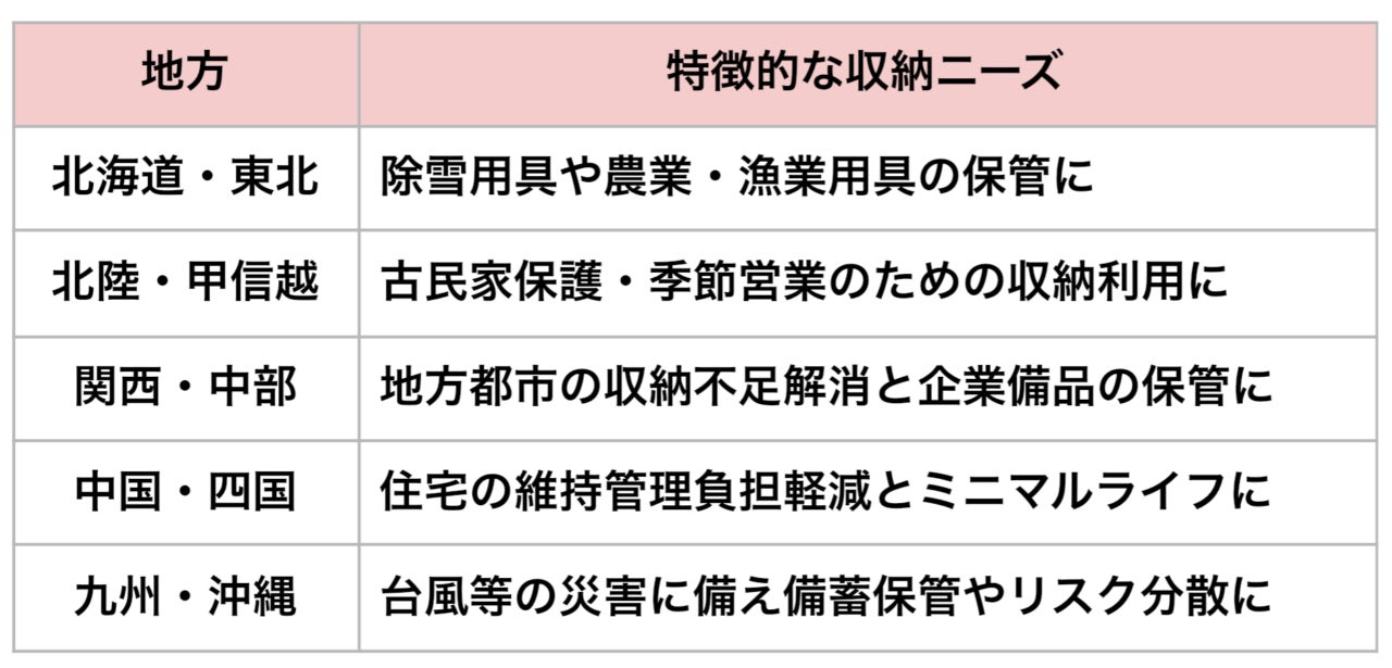 各地方で特徴的だった収納ニーズをピックアップしてまとめてみると、暮らし方や社会的背景が、トランクルームを活用するニーズに大きな影響を及ぼしていることがわかります。地域の気候や文化に根ざした多様なニーズが顕在化している結果ともいえるでしょう。