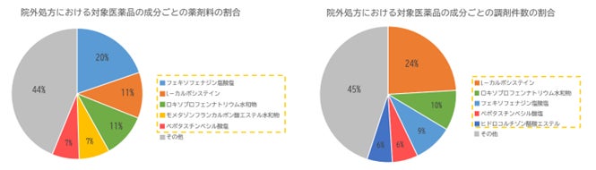 まず、対象医薬品の院外処方における薬剤料と調剤件数の割合について調査しました。