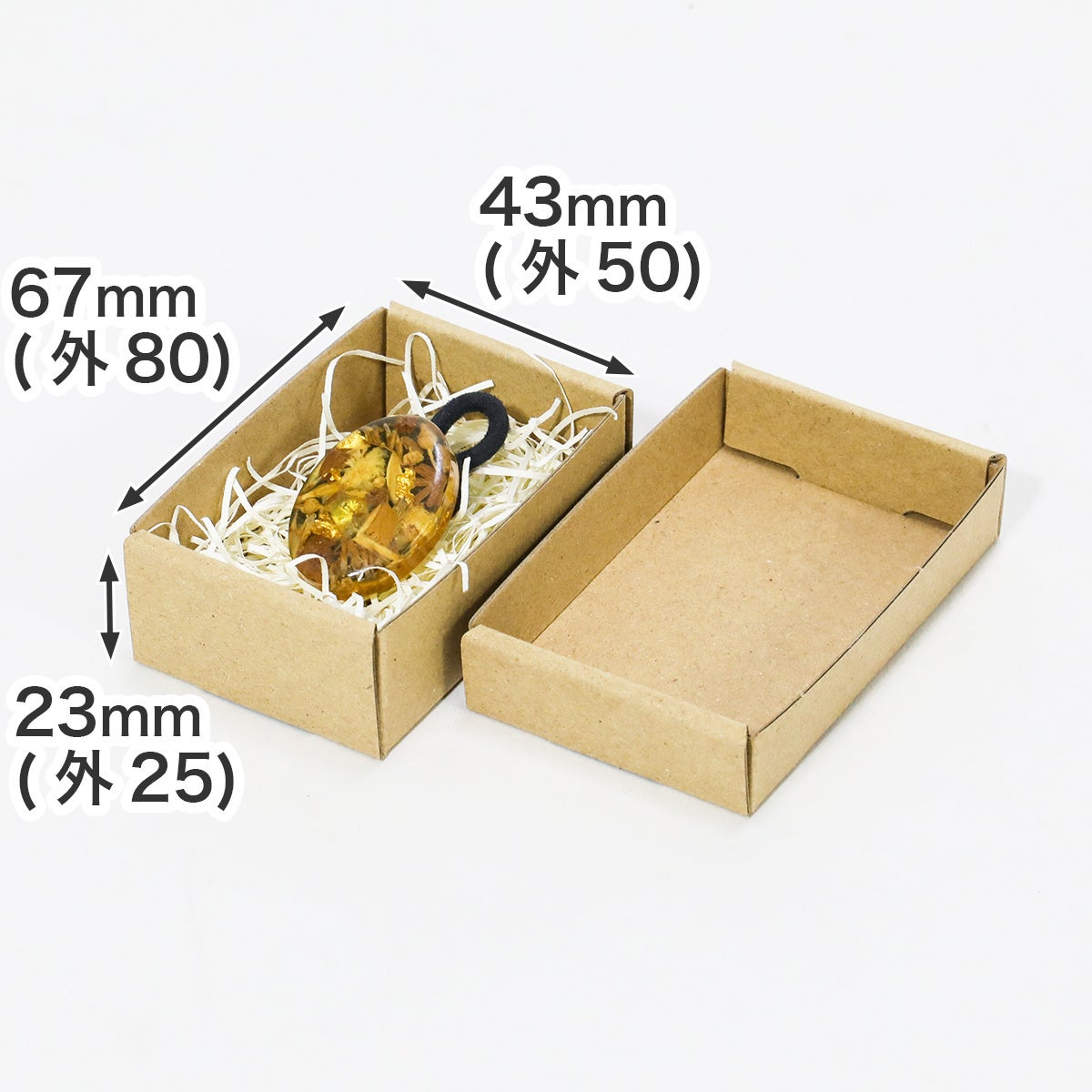 箱の寸法は長形3号封筒に入るように調整し、箱の深さはフリマアプリの配送規格(30mm以内)に収まるよう、外寸25mmに設計。箱を封筒に入れることで、定形外郵便などの配送サービスを利用して商品発送が可能。