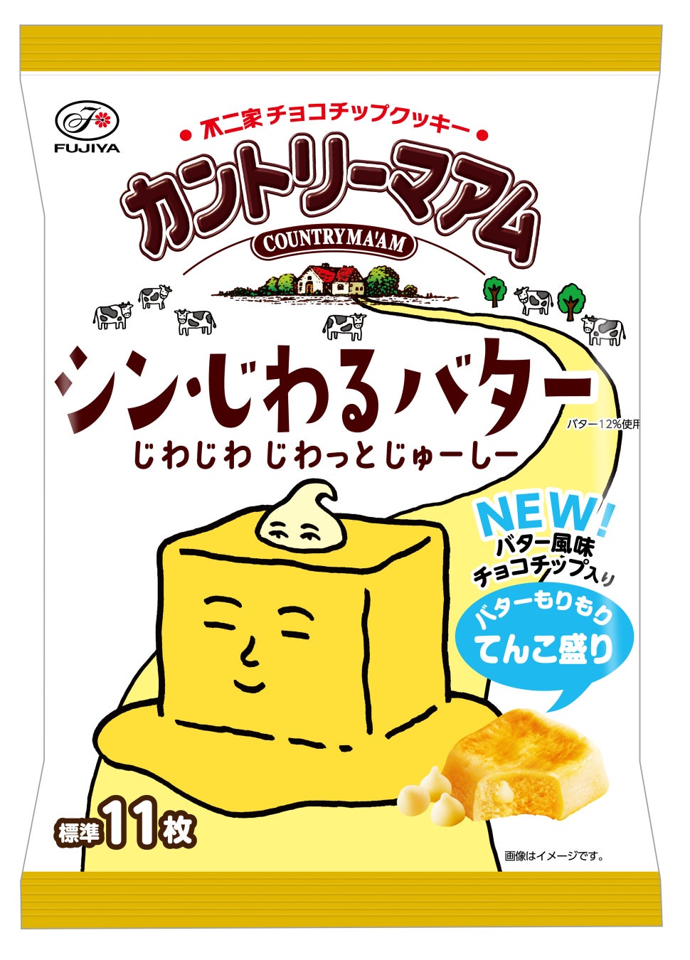 「カントリーマアムチョコまみれ」を中心に展開中の“まみれワールド”より、しっとり感とたっぷりバターの背徳感ある組み合わせで好評だった「カントリーマアムじわるバター」が、バター風味のチョコチップを使用した品質にリニューアルして再登場します。カントリーマアムの特長である「しっとり感」「チョコチップ」を網羅し“真”の姿に進化した「シン・じわるバター」。個包装は「カントリーマアムじわるバター」のキャラクター「じわーるくん」が、バター風味のチョコチップ入りになるまでのストーリーが描かれた楽しいデザイン。おいしく遊び心ある“まみれワールド”をぜひお楽しみください。※バター香料使用