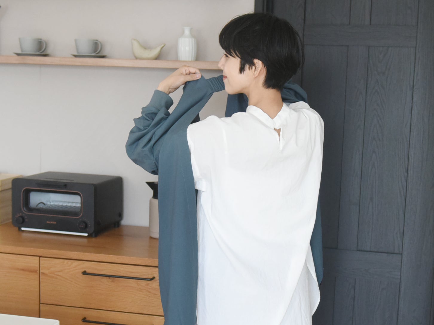 出勤前の慌ただしい朝も、帰ってきてからの夕食準備も、すぽっと被るだけで家事モードON。