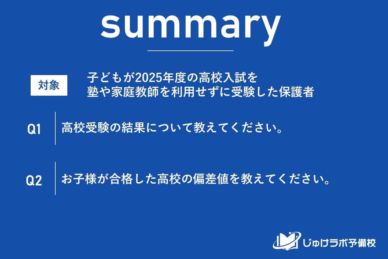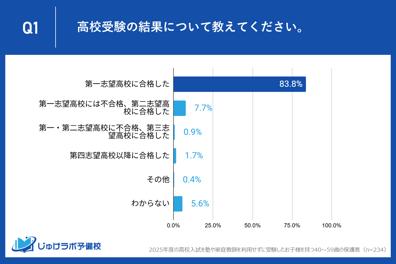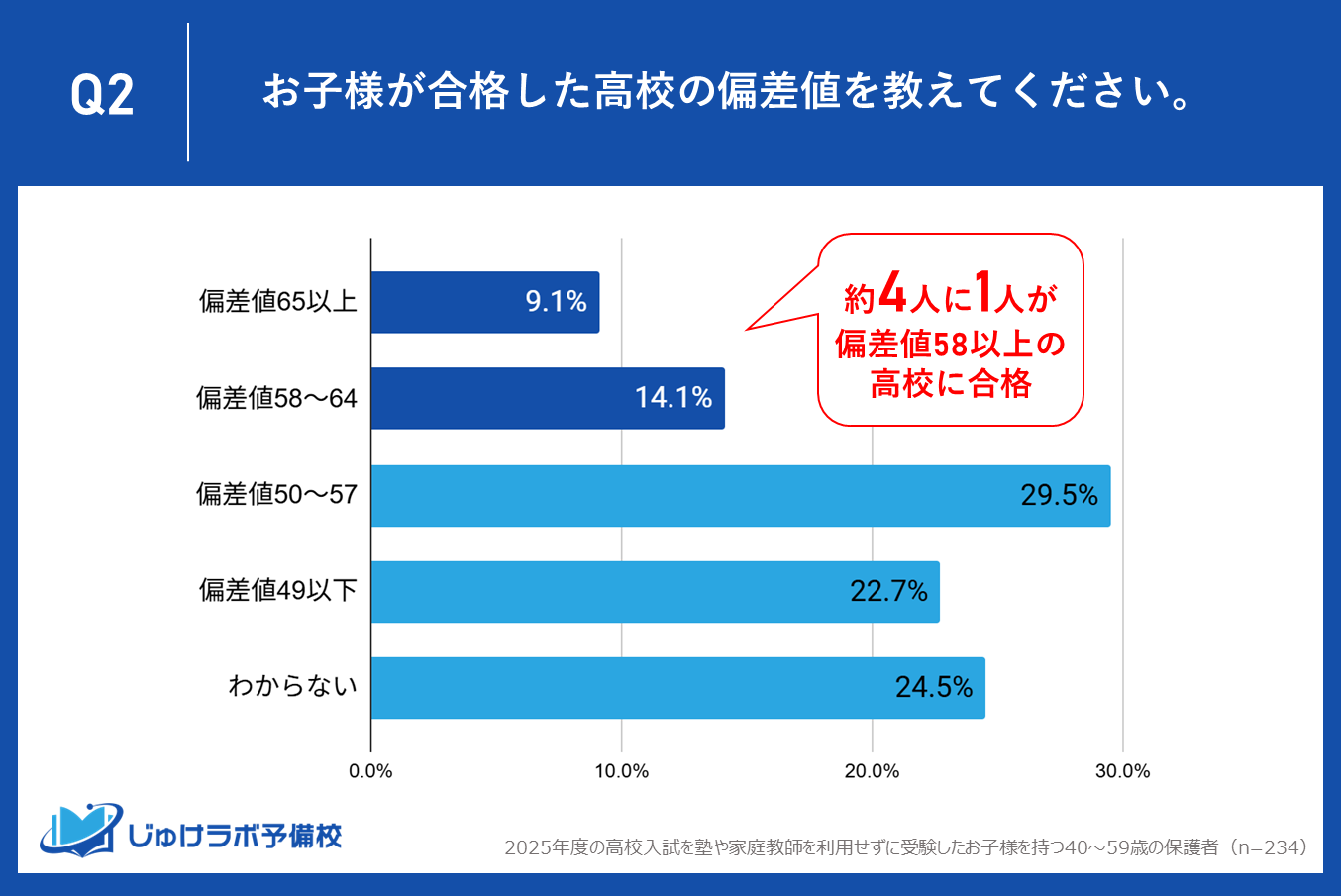 じゅけラボ予備校(所在地:大阪市北区、代表取締役:後藤智則)は、2025年度の高校入試において、お子様が塾や家庭教師を利用せずに受験したと回答した40~59歳の保護者234名を対象に、高校受験に関するアンケート調査を実施しました。