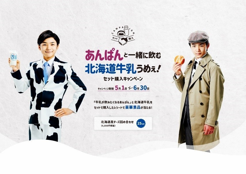 ミルクランド北海道と木村屋總本店が共同開発した「牛乳が飲みたくなるあんぱん」と北海道産牛乳を同時に購入した方限定で、総勢25名様に北海道産チーズ詰め合わせが当たるキャンペーンを期間限定で実施いたします。