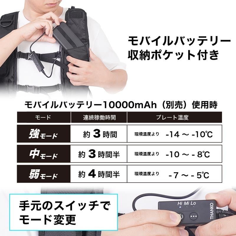 電源はお手持ちのモバイルバッテリーが使えるUSB給電方式。小型冷蔵庫などに搭載されるペルチェ冷却システムを採用。電源を入れると背中左右に搭載された冷却プレートが環境温度から約-14度に冷えて冷却。暑い夏でも快適に過ごすことが可能です。手元のリモコンで弱中強の3段階切り替えが可能。10000mAhのモバイルバッテリー使用時で最大4.5時間稼働(弱モード時)します。モバイルバッテリーは前側のポケットに収納可能。M~3L(胸囲160cm)まで対応。ベルトでしっかりと締められるのでフィット感の調整が可能。冷却ユニット部分を取り外して洗濯機で洗濯が可能。いつでも清潔にお使いいただけます。墜落制止用器具ハーネスに対応。ファン付ウェアの中に本製品を着て使用も可能です。