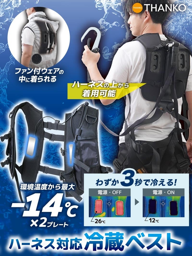 夏の過酷な作業時に 冷却プレートで暑さ対策 高所作業時のハーネスに対応した