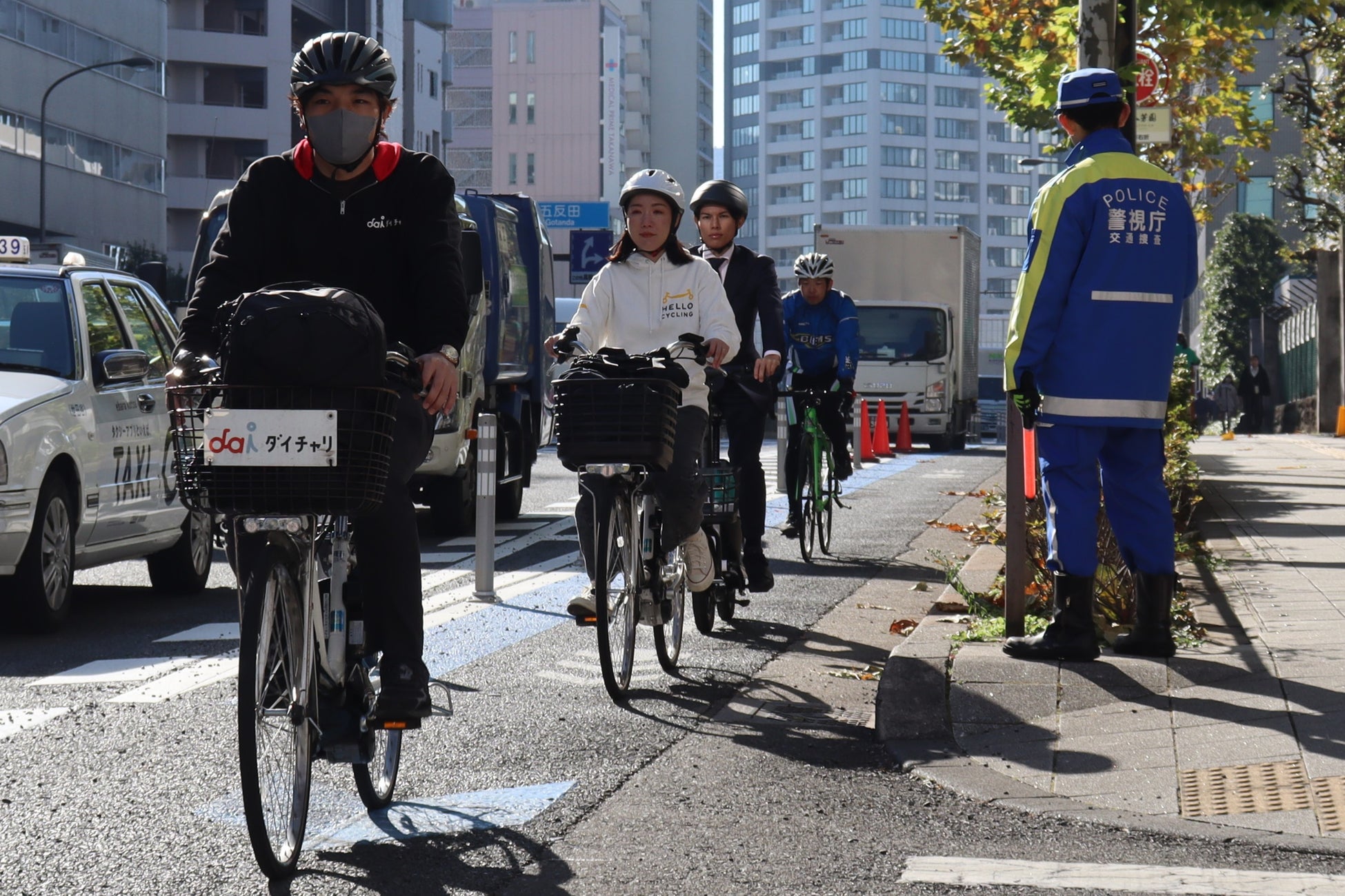 今回は警視庁交通総務課、交通規制課、高輪警察署及び国土交通省東京国道事務所が「国道1号における駐車車両に配意した自転車通行空間整備に伴う自転車通行のルール・マナー啓発活動」を実施しました。当社は、東京都港区の明治学院前交差点を起点に、警視庁自転車安全利用指導啓発隊(BEEMSビームス)とともに、国道1号で模範デモ走行を行いました。