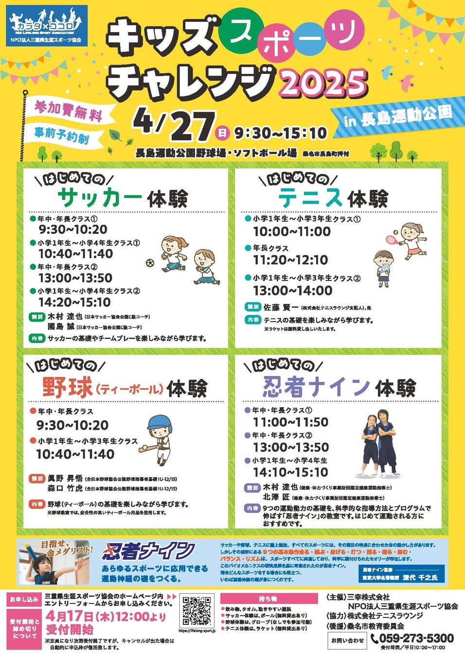 特定非営利活動法人三重県生涯スポーツ協会(三重県津市、理事長 竹田昌平)と三幸株式会社(東京都千代田区、代表取締役社長 橋本有史)は、4月27日(日)に桑名市の長島運動公園(桑名市長島町押付)にて「キッズスポーツチャレンジ2025」を開催いたします。