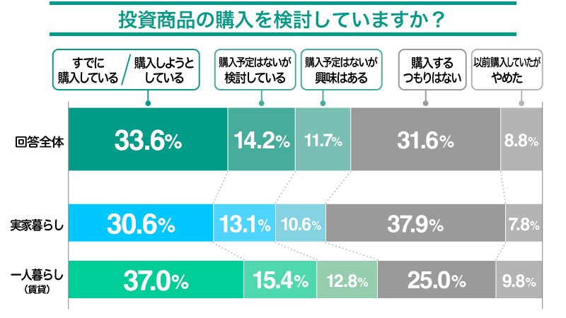 居住形態別でみると、既に投資を行っている、または購入を予定している方の割合は、一人暮らし(賃貸)で37.0%、実家暮らしで30.6%と、一人暮らし(賃貸)の方が投資について積極的な姿勢がみられました。