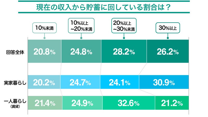 社会人5年目までの2人に1人が、収入の20%以上を貯蓄に!更に収入の30%以上を貯蓄に回している人の割合は、実家暮らしの方が高い結果に。