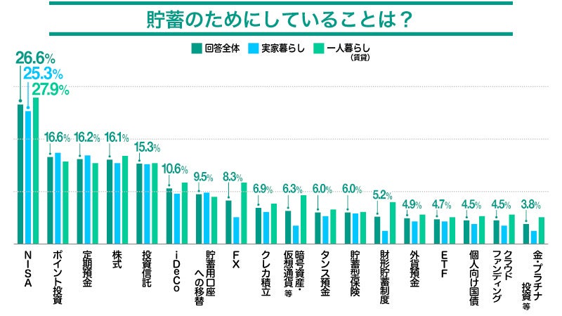 貯蓄のためにしていることは2024年に新制度がスタートした話題の「NISA」が1位に!一人暮らし(賃貸)は実家暮らしに比べて、収入のうち貯蓄に回す割合は低いが、短期売買で少額投資が可能なFXや暗号資産にも積極的。