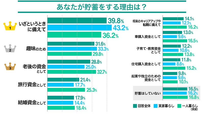 貯蓄の目的に関する調査では、実家暮らし、一人暮らし(賃貸)共に、「いざというときに備えて」(39.8%)が最多となり、予期せぬ事態に備えることを最も重視していることが分かります。居住形態別でみると、実家暮らしは「趣味のため」が2番目に多いのに対し、一人暮らし(賃貸)では「老後のため」が2位にきていることから、一人暮らし(賃貸)の方が将来のお金に対する意識が高いことがうかがえます。