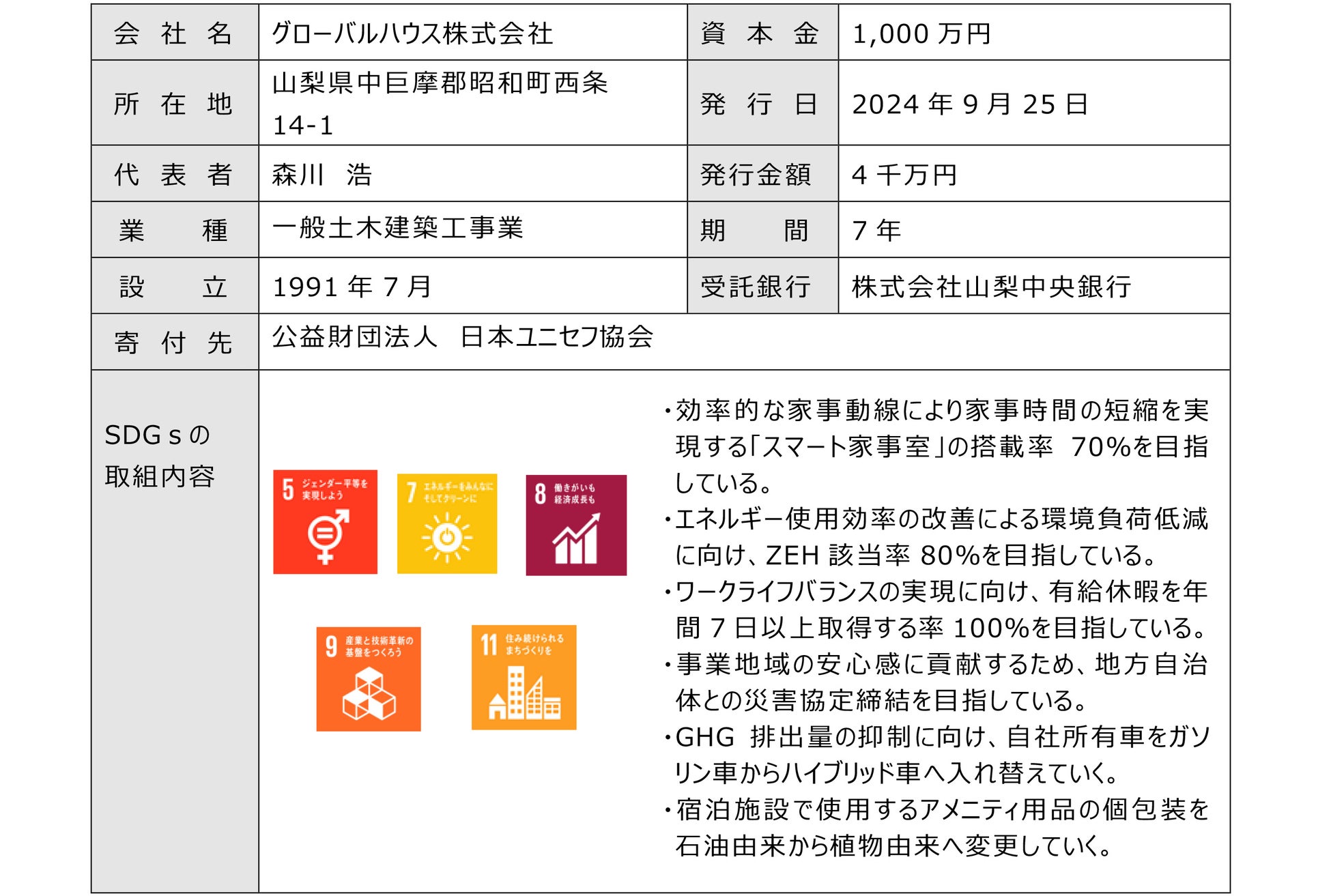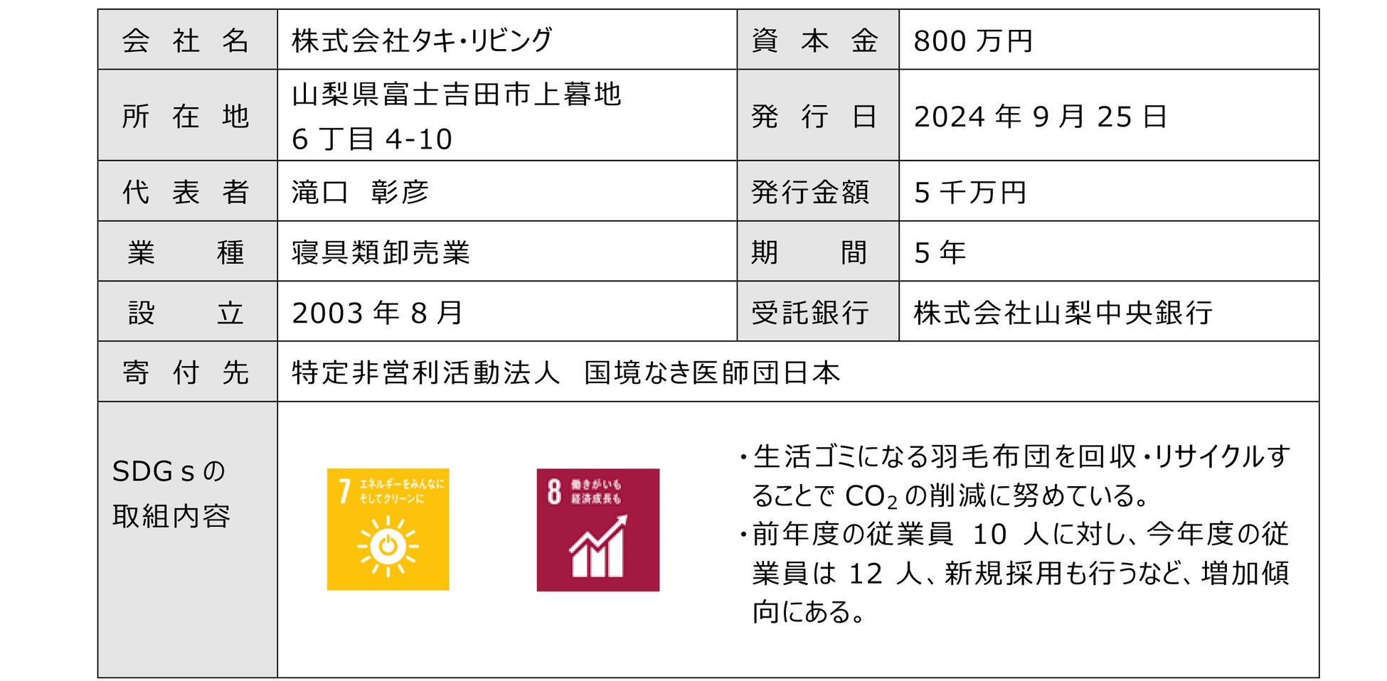 株式会社山梨中央銀行(頭取 古屋 賀章)は、寄付オプション付私募債「山梨中銀 SDGs私募債」2件/9千万円を受託しました。