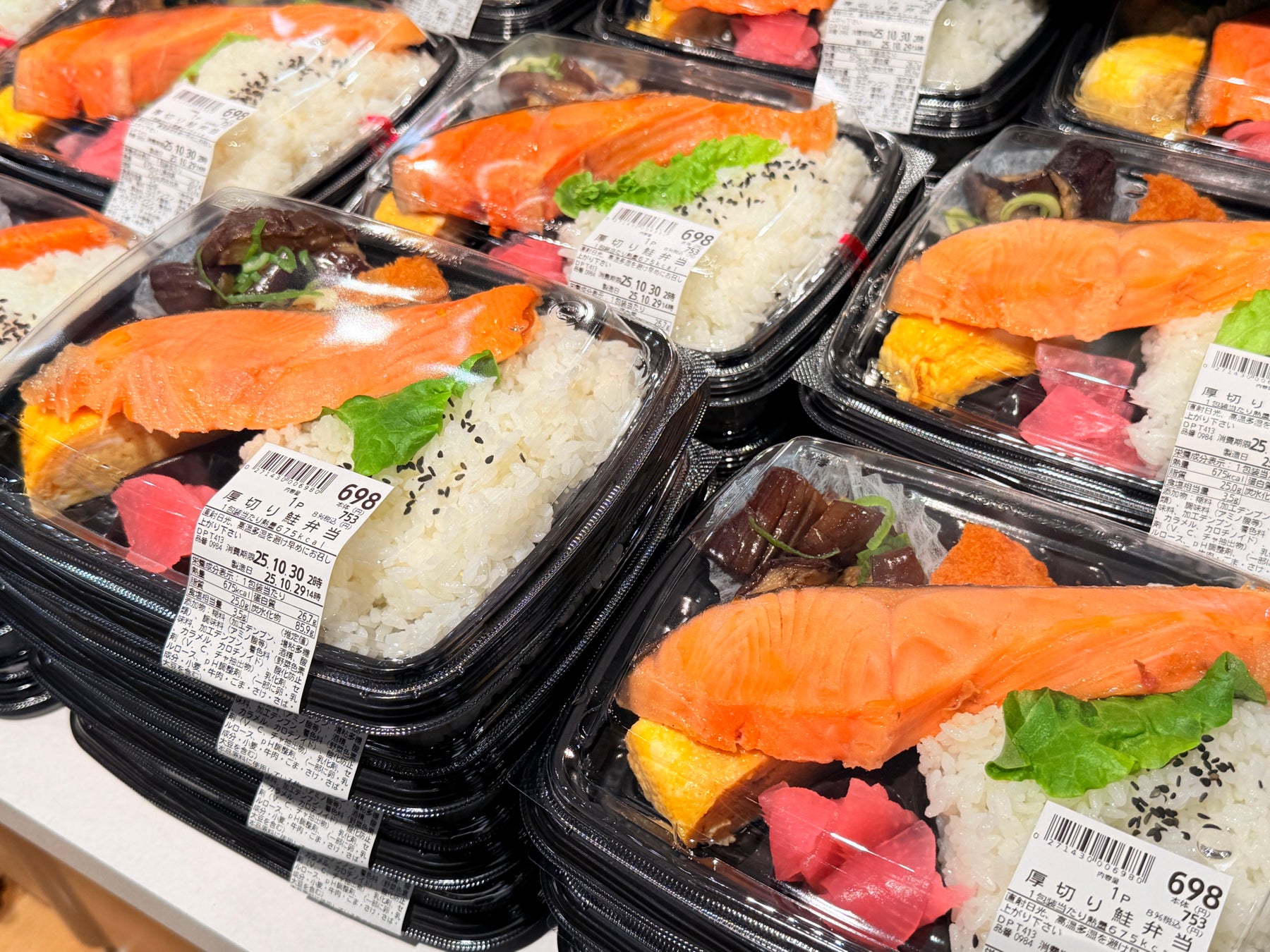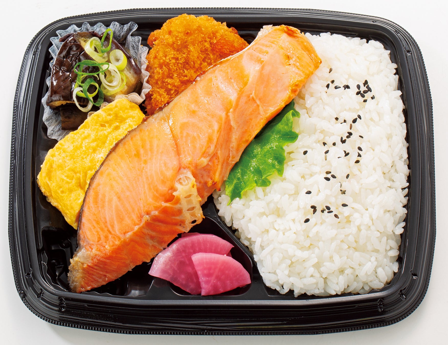当社オリジナルの塩水加工で、ほどよい塩味に仕上げた大ぶりの鮭が自慢の「厚切り鮭弁当」 や、1本ずつ丁寧に焼き上げた「出汁がじゅわっと溢れ出す玉子焼」などの出来立て商品をご用意いたします。