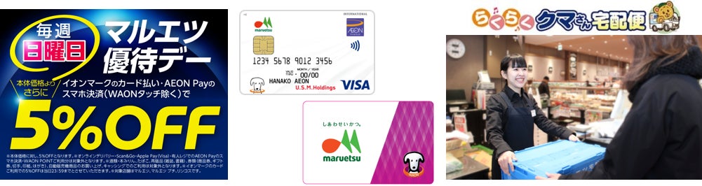 マルエツではイオンマークのクレジットカードをご利用のお客さまを対象に、毎週日曜日のお買い物がお得になる独自の優待施策を実施しています。また、「WAON POINT」を全店で導入し、様々なポイント企画を実施しております。たくさんのお買い物に便利な「らくらくクマさん宅配便」サービスでは、店内でお買上げいただいた商品を3時間以内にご自宅まで配達いたします。また、即時配達サービスUber Eatsに対応し、ご自宅でもマルエツのお買い物をお楽しみいただけます。
