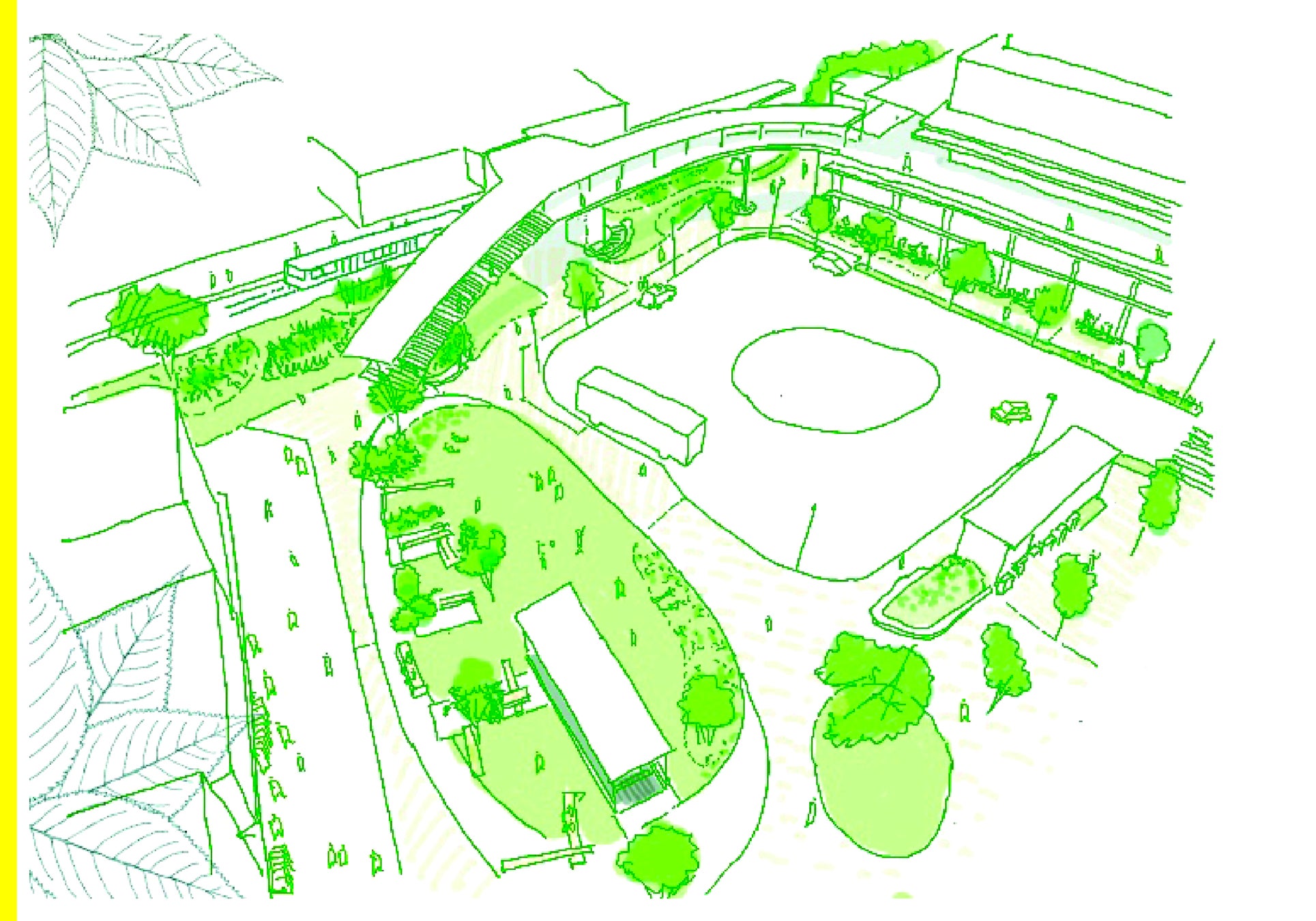 緑豊かで人懐っこい風景を継承したいという思いから、新しい再開発エリアと既存のまちと駅が分断されないようにおおきなアーチ状のデッキでつなぐ予定です。