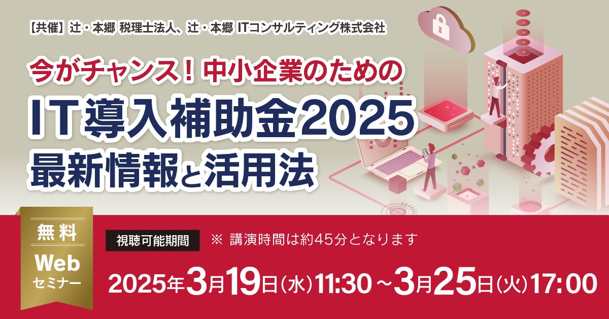 辻・本郷 税理士法人(本社:東京都新宿区、理事長:桑木小恵子)は、辻・本郷 ITコンサルティング株式会社(本社:東京都渋谷区、代表取締役社長:黒仁田健)と共催で、2025年3月19日(水)より「今がチャンス! 中小企業のためのIT導入補助金2025最新情報と活用法」セミナーを開催いたします。IT導入補助金は、中小企業の経営革新や生産性向上に役立つITツールの導入を支援する制度です。今回のIT導入補助金2025では最低賃金引き上げへの対応促進のため補助率が増加されています。さらに、IT活用の定着を促す導入後の活用支援が対象とされ、今後より重要となるサイバーセキュリティ対策も強化が図られています。本セミナーでは、IT導入補助金2025の概要やメリット、申請方法などをわかりやすく解説し、実際にIT導入補助金を活用した中小企業の事例も紹介します。