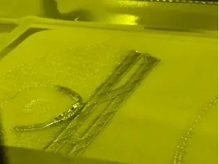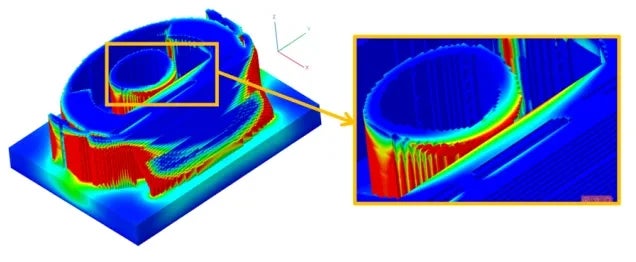シミュレーションの結果、部品の歪みは許容範囲内に抑えられていることが示されました。しかし、Z方向に沿って単層の厚みを超える大きな反りが見られました。各レイヤーの厚さは50μmであるため、この値を超える反り変位は、ブレードと印刷部品の衝突を引き起こし、最終的に印刷プロセス全体の失敗につながる可能性があります。実際の造形を行った結果、反りはシミュレーションの予測と完全に一致いたしました。