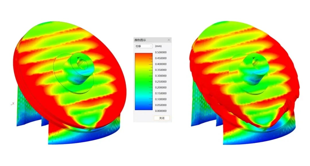 プロセス1から得た知見を踏まえ、別のバージョンのサポート構造を再設計しました。プロセス1で大きな歪みが発生した箇所に必要なサポートを追加し、2回目の反復シミュレーションを開始したところ、新しい結果でも最大許容変位は0.5mmに設定されました。