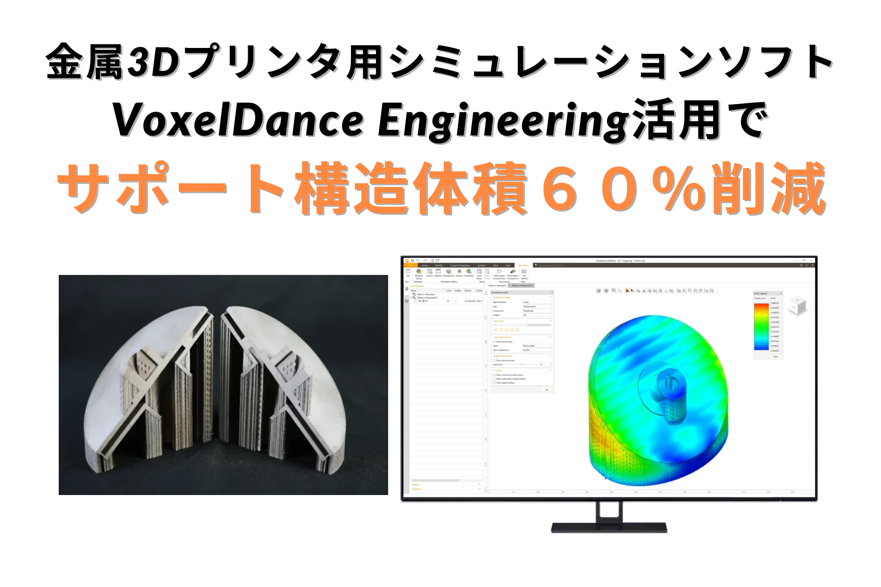 サポートの設計を最適化するために使用した VoxelDance Engineering (VDE) は製造プロセス全体の仮想シミュレーションを提供し、サポート設計のさらなる最適化と調整を可能にし、最終的に造形を成功させるための信頼性の高いソリューションを提供しました。
