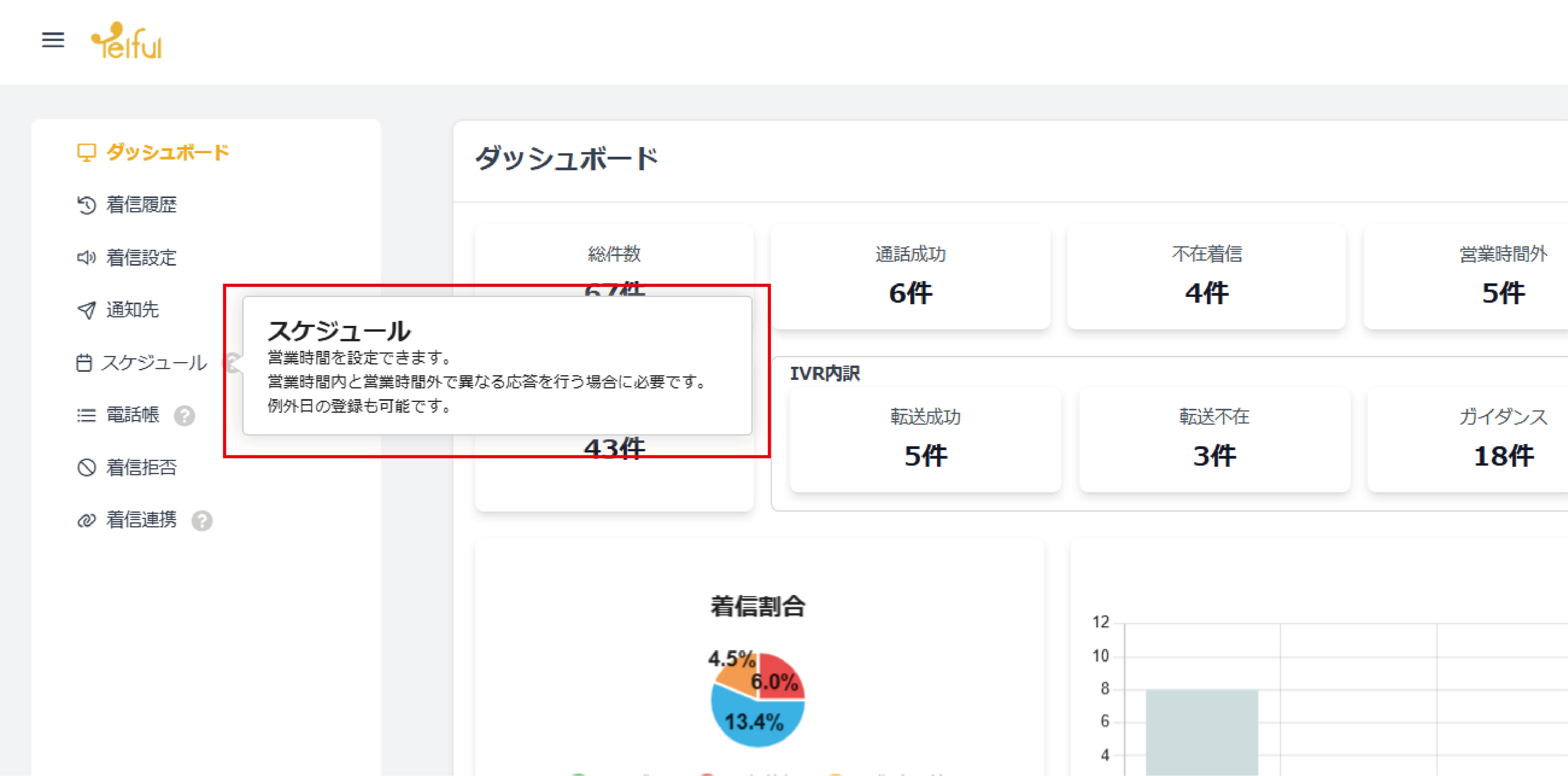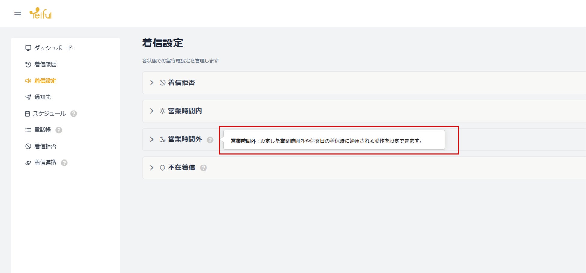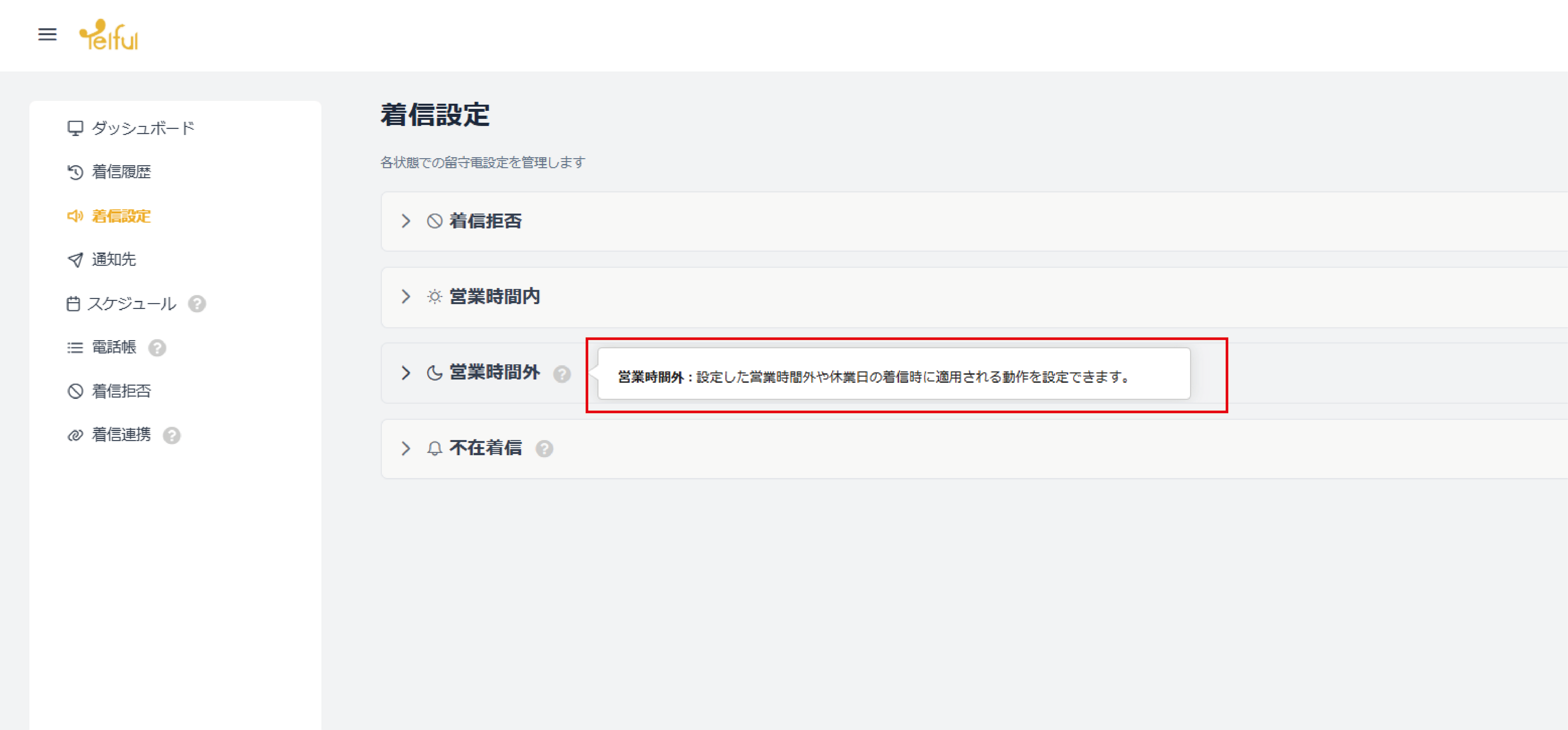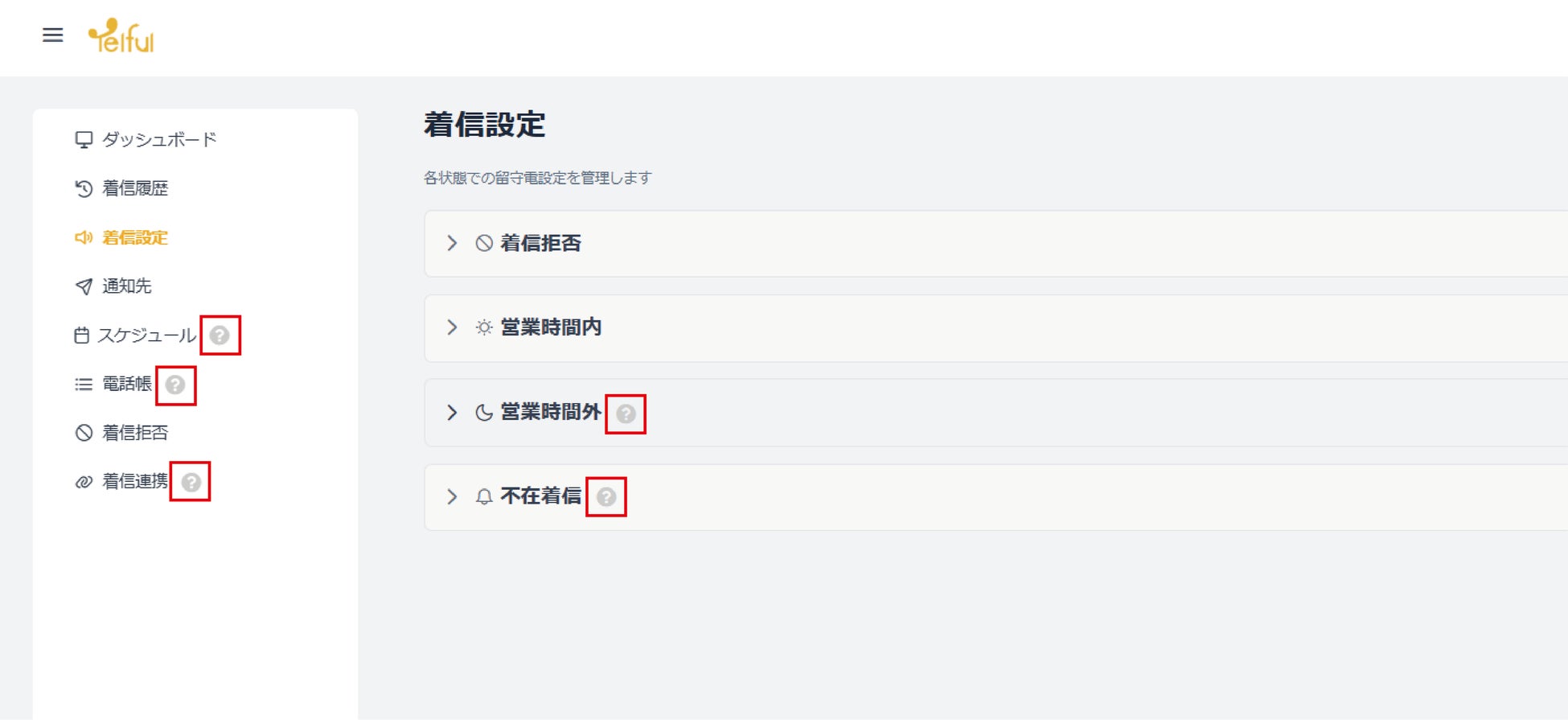 例えば、「スケジュール」機能が、電話対応の設定をする上で、「営業時間内と営業時間外で異なる応答を行う場合に必要」「例外日の登録も可能」であることは、初見の方には伝わりづらいかと思います。そういった機能の説明が、「?マーク」にマウスカーソルを合わせるだけで、表示されるようになりました。