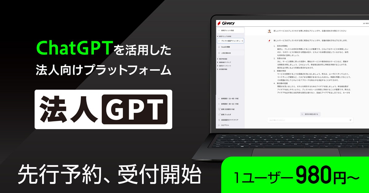 ギブリー、ChatGPTを活用した法人向けプラットフォーム「法人GPT」を1ユーザーあたり980円~で提供。3月24日より先行予約の受付を開始。