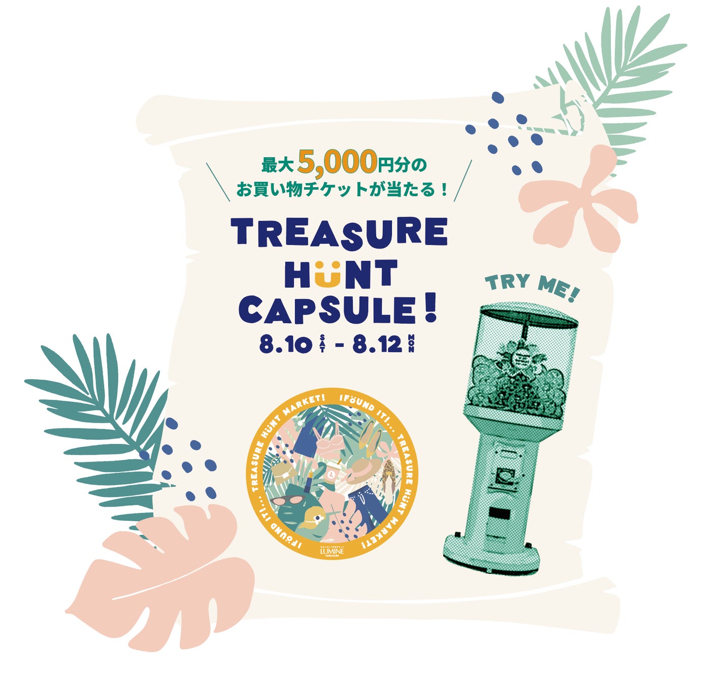 ・内容:館内に隠されたキーワードをインフォメーションカウンターで伝えるとコインをプレゼント。コインを使って最大5,000円分のお買い物チケットが当たるガチャガチャにチャレンジ!
