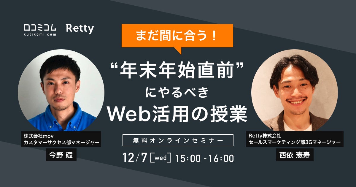 実名口コミグルメサービス「Retty」を運営するRetty株式会社(本社:東京都港区、代表取締役:武田 和也)は、口コミコムを運営する株式会社mov(本社:東京都渋谷区、代表取締役:渡邊 誠)と共催で、飲食店向けWebセミナー「まだ間に合う!"年末年始直前"にやるべきWeb活用の授業」を12月7日(水)15:00〜16:00で開催します。Rettyは飲食店のみなさまがよりよい集客を実現し、Happyな食体験を生み続けられるようサポートしてまいります。