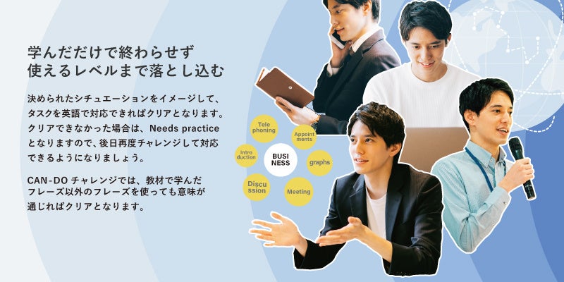 できるようになるまで何度も繰り返しチャレンジすることで「使える英語力」が身に付き、実際のビジネスシーンでも対応できるようになります。
