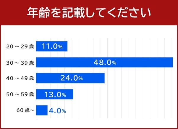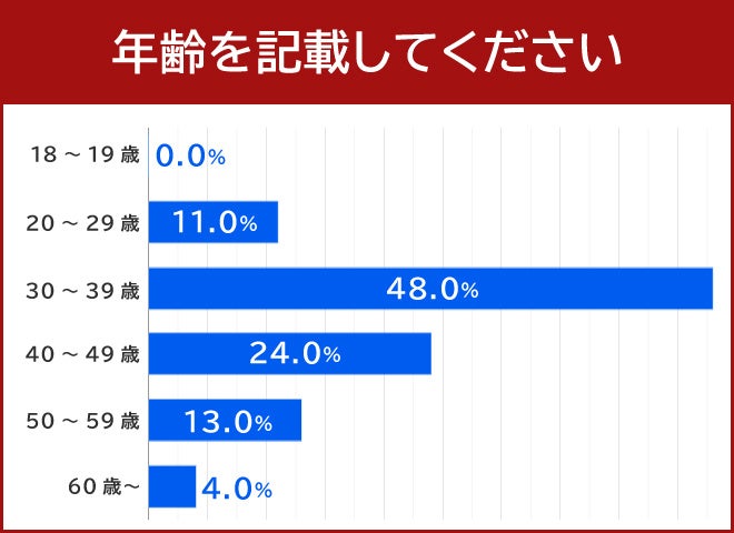 年齢についての質問では、48.0%の方が「30~39歳」と回答し、30代の人が約半数となっています。次に40代の方が多く24.0%を占めており、30~49歳の方で約7割を占める結果となりました。