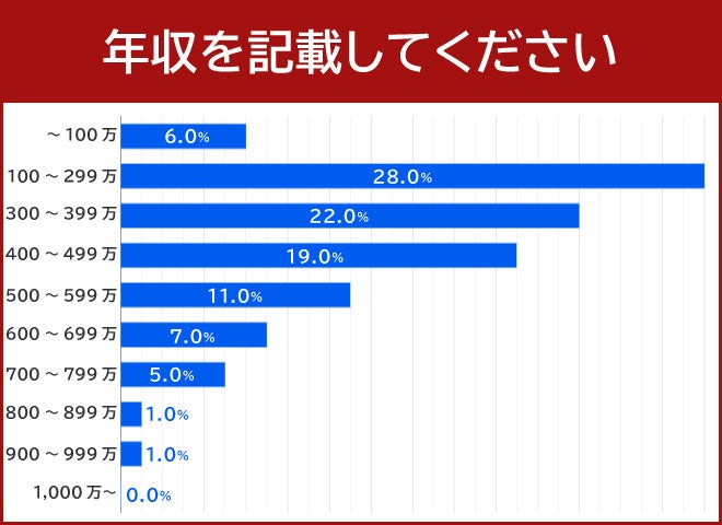 年収について質問したところ、28.0%の方が「年収100万円~299万円」と回答しました。比較的若い世代が多いことから、高めの年収の方は少ない印象となっています。