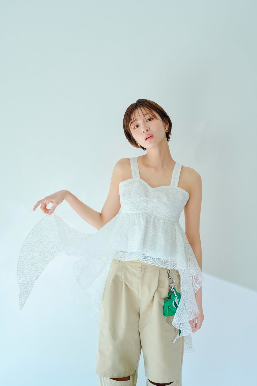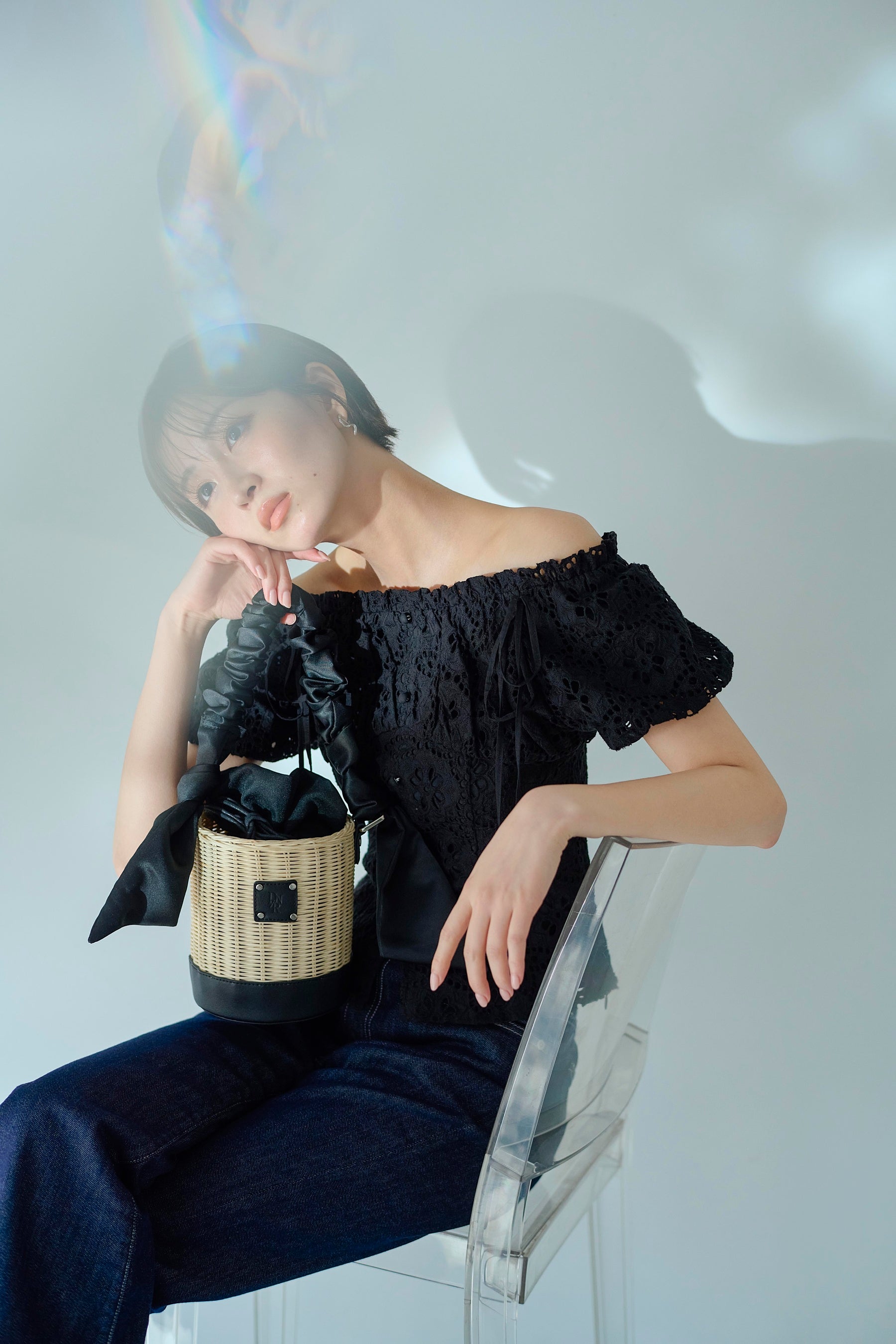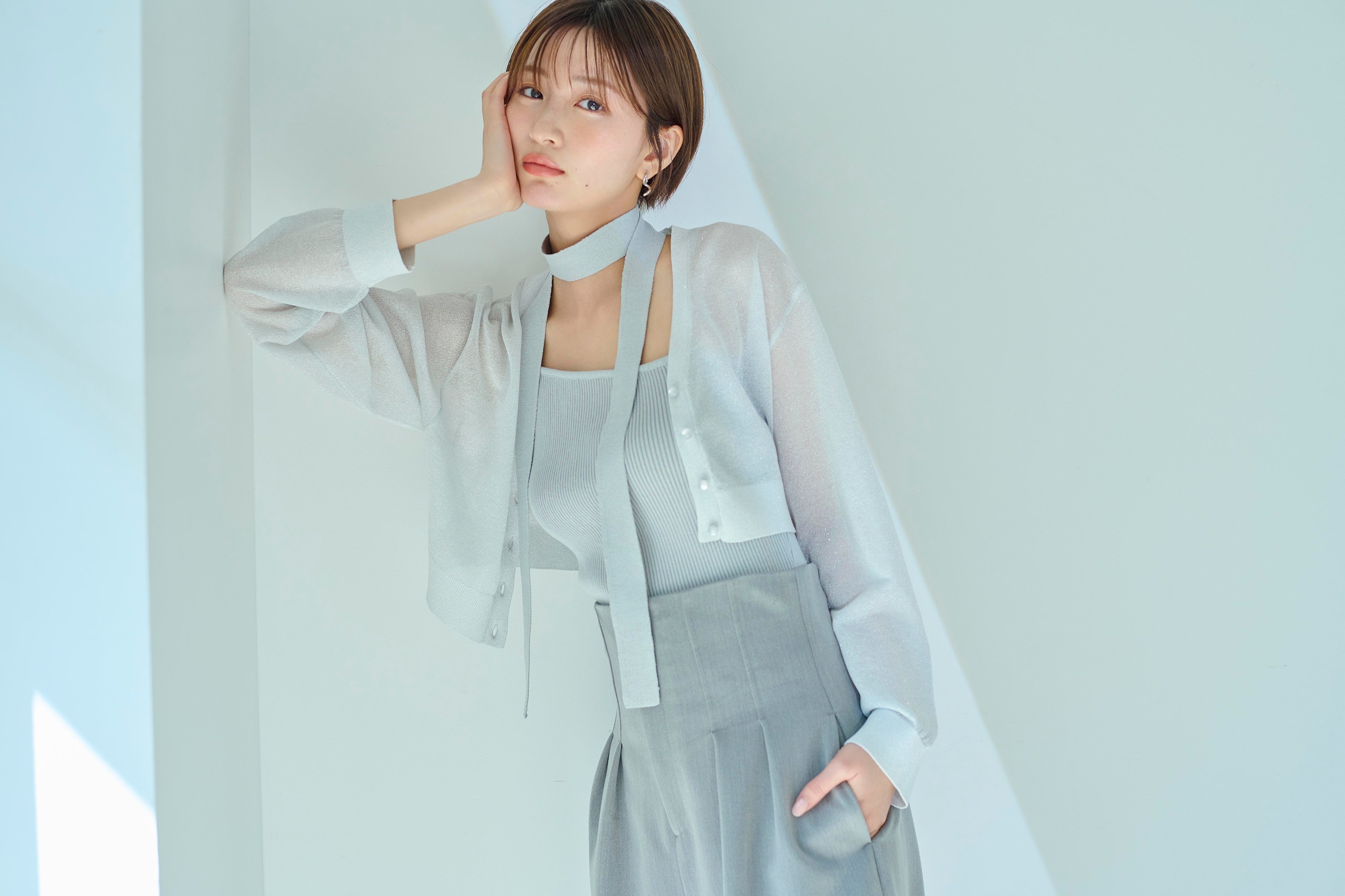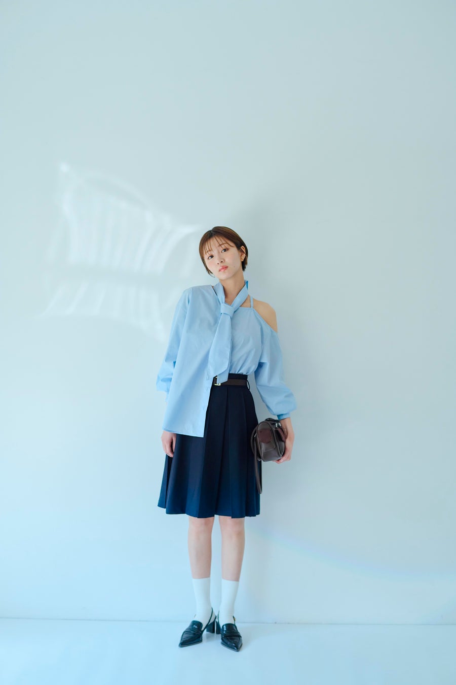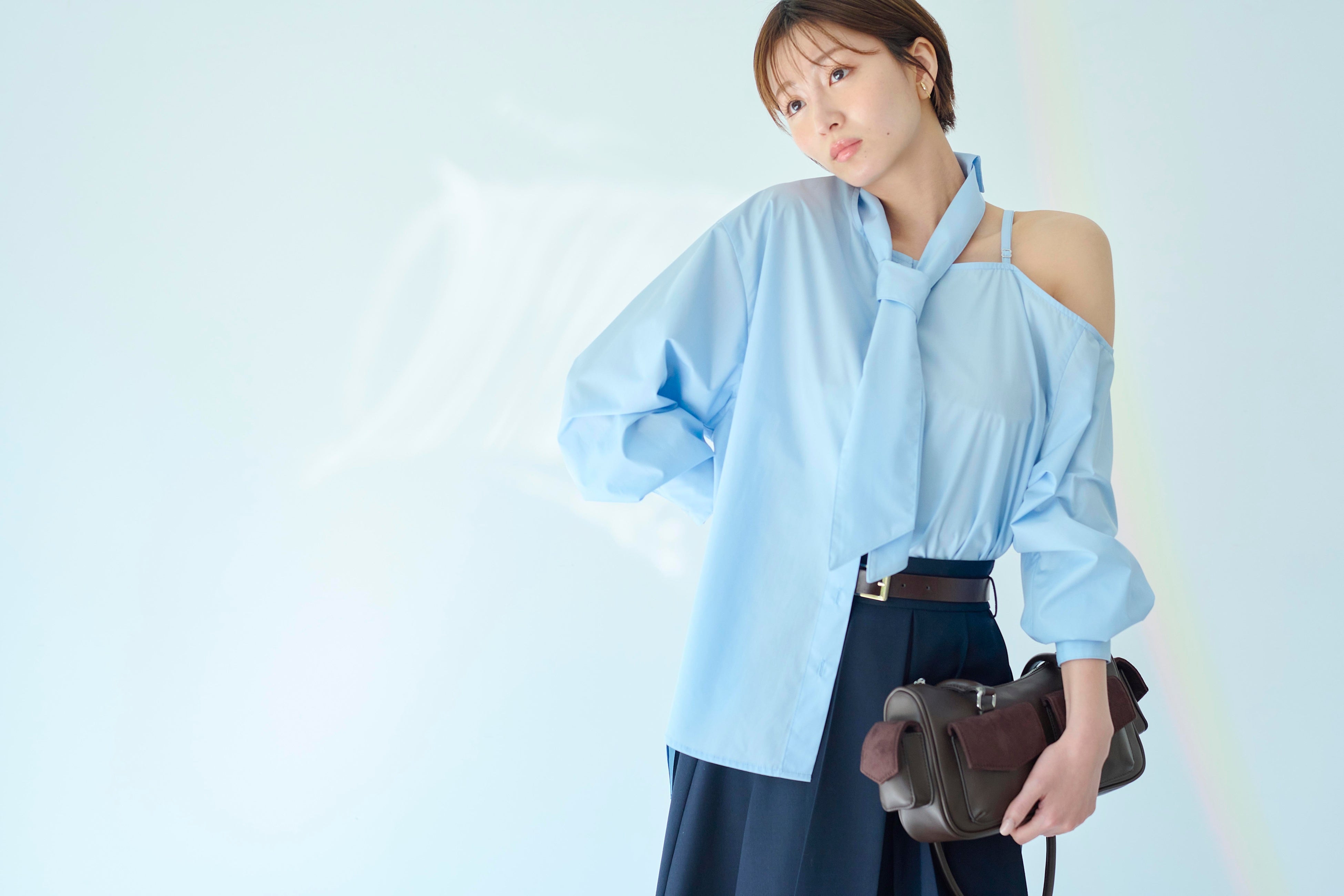 今回のWEBマガジンでは、ネクタイモチーフにフェミニンな肌見せをプラスしたデザインシャツや、スクールライクなデザインのミディ丈スカートのコーディネート、大胆なフリルでレースを表現したブラウス×カットアウトパンツのヘルシーコーディネートなど、全5種類のスタイリングを着こなしています。
