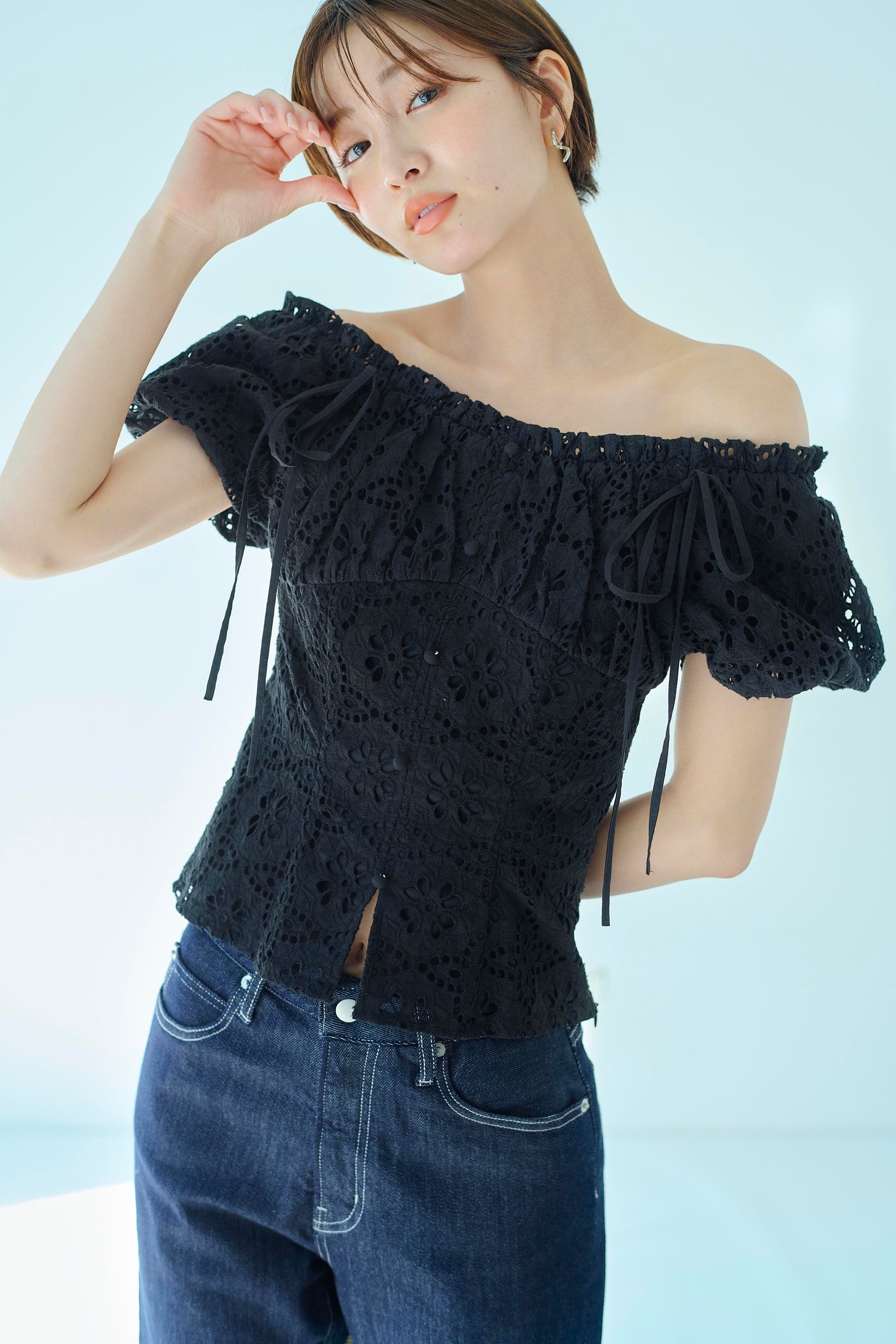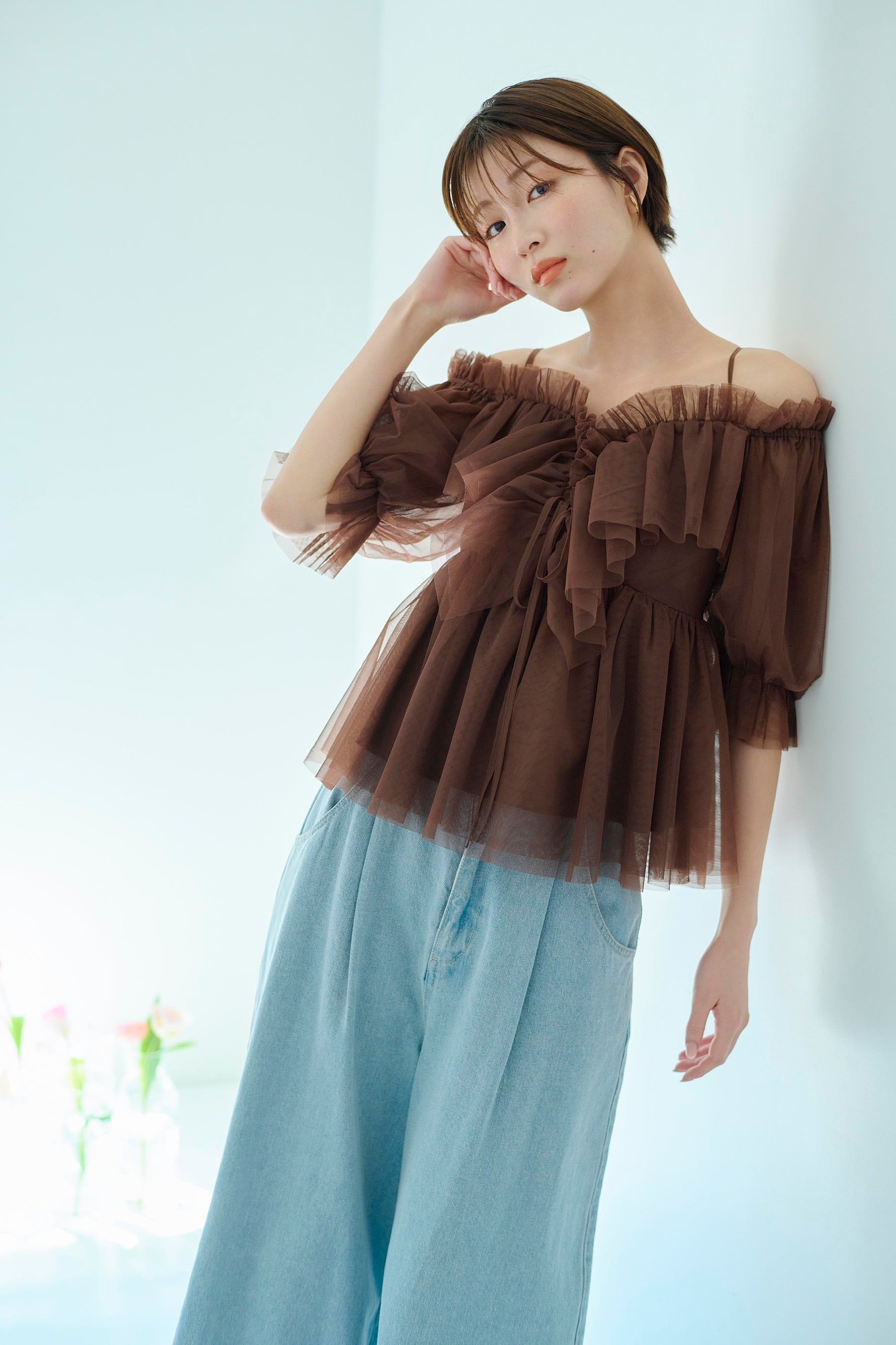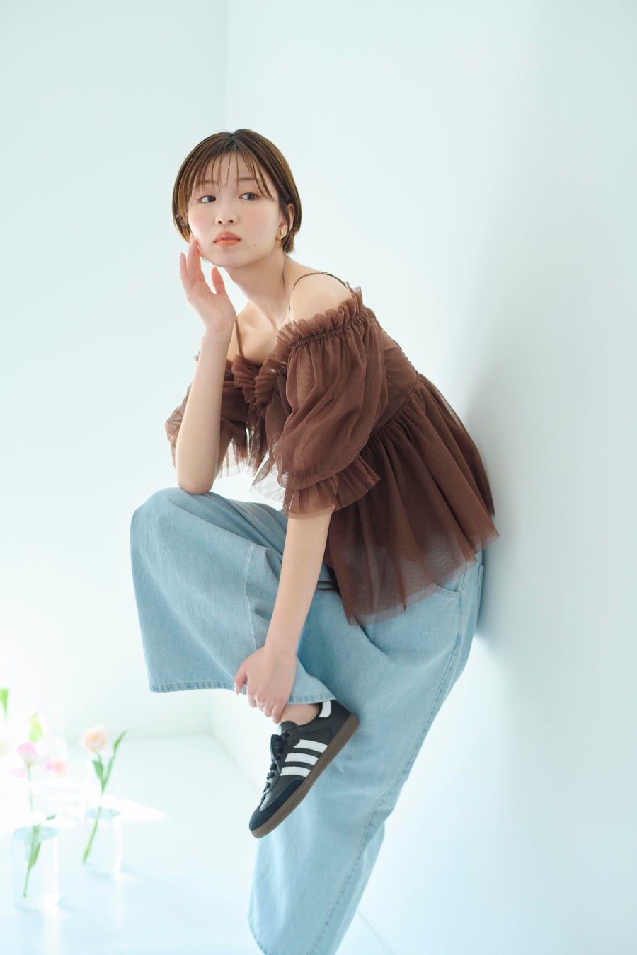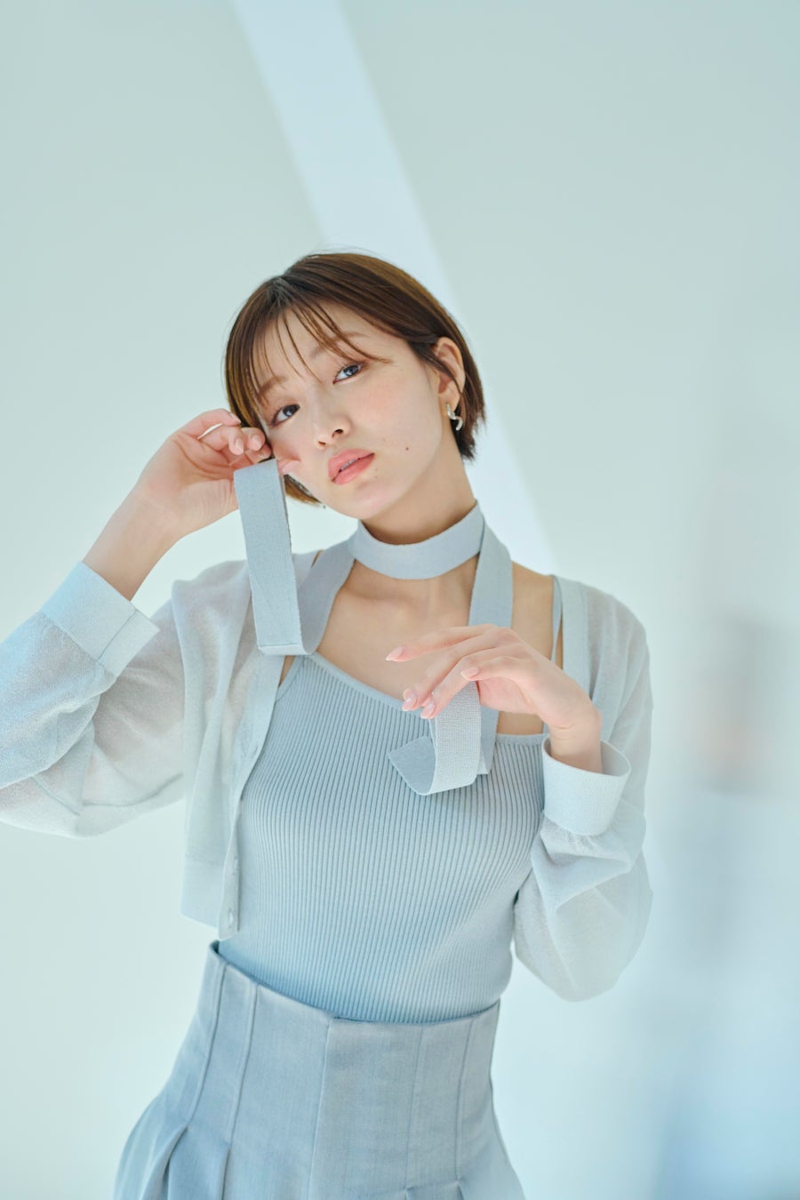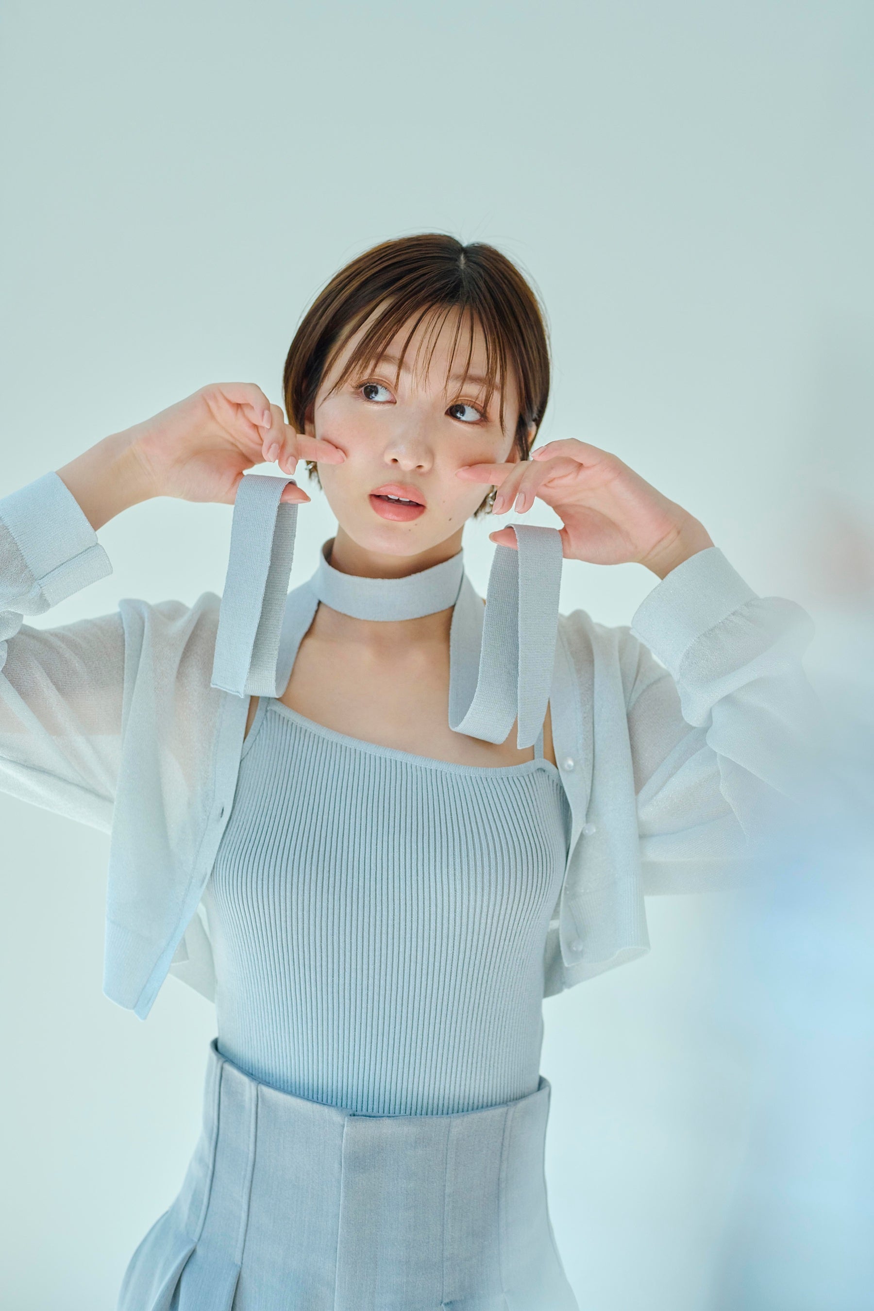 今回のWEBマガジンでは、ネクタイモチーフにフェミニンな肌見せをプラスしたデザインシャツや、スクールライクなデザインのミディ丈スカートのコーディネート、大胆なフリルでレースを表現したブラウス×カットアウトパンツのヘルシーコーディネートなど、全5種類のスタイリングを着こなしています。