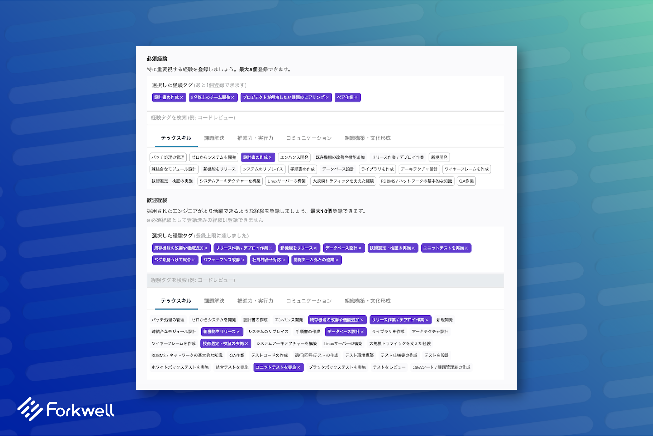 フォークウェルは昨年、エンジニアが直感的に経験を選択・入力することで、自身のスキルセットを簡単に公開できる「経験タグ」機能を開発しました。この「経験タグ」機能をもとに、採用担当者が抱える課題を解決すべく、求人票の必須要件・歓迎要件にマッチするエンジニアを見つけやすくなる新機能を、この度リリースしました。