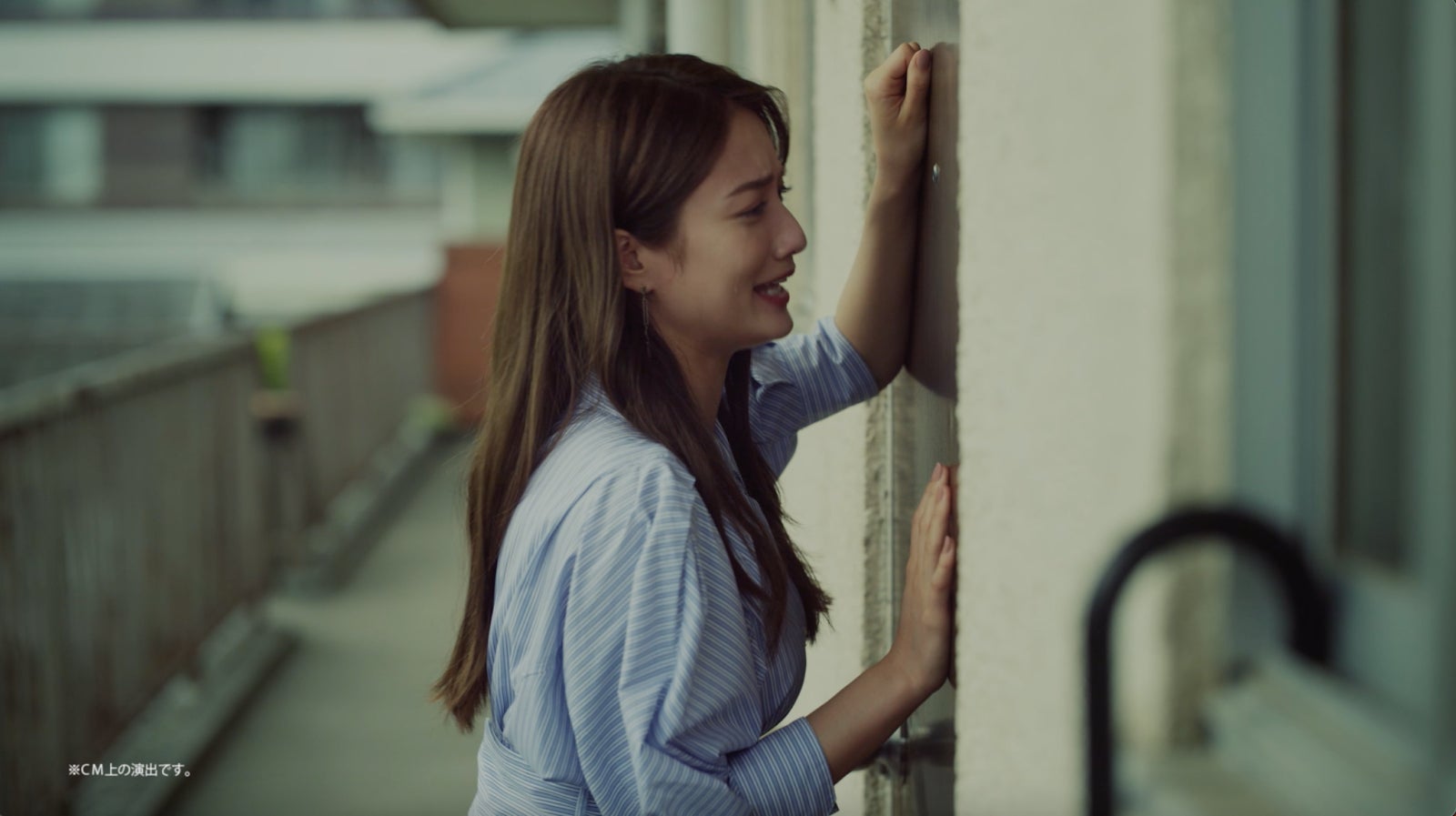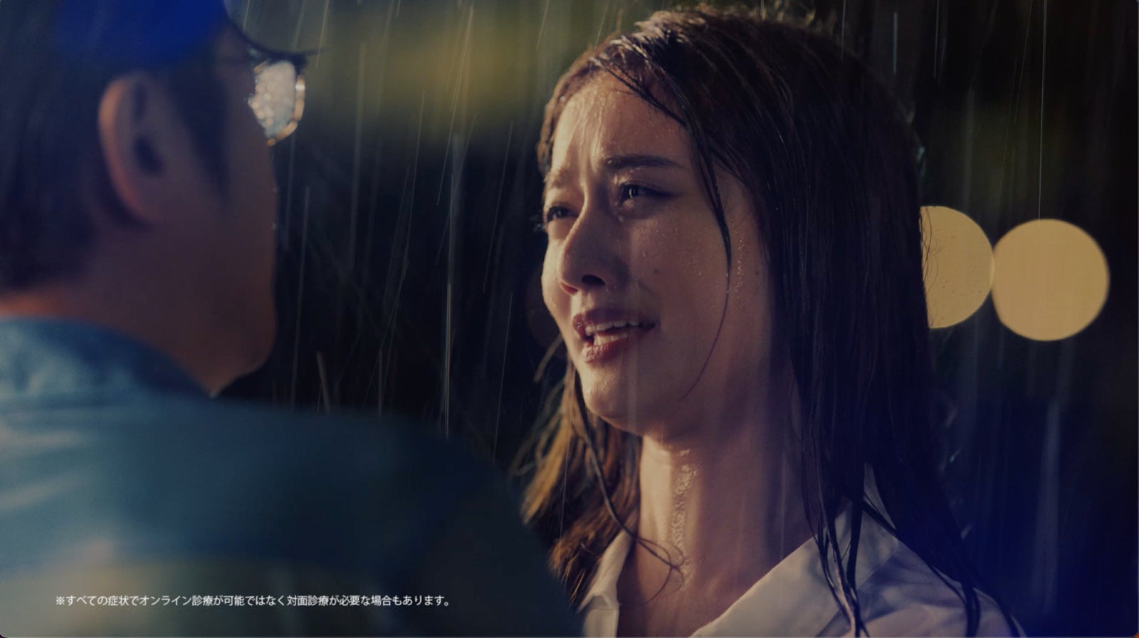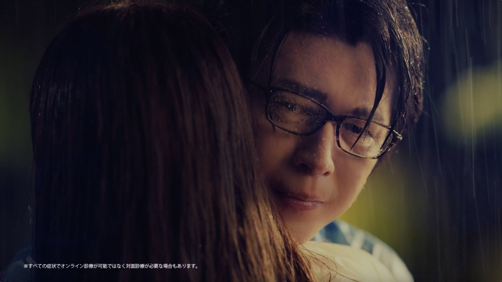 雨が降りそそぐなか、強く抱きしめあう及川光博さんと谷まりあさん。「約束する。どんな時もキミと離れない。」と及川さんが伝えます。「風邪っぽくても?」と問いかけた谷さんに「ソクヤクする。」と大きく頷く及川さん。及川さんの胸から離れ、「すぐに病院行きたくても?」と谷さんがさらに問いかけます。「ソクヤクする!」と再び強く抱きしめた及川さんに、嬉しそうな表情を見せる谷さん。「SOKUYAKU」アプリから医師によるオンライン診療を受診したところ、医師からは「まずは、傘をさしましょう」とたしなめられ、バックハグをした2人が幸せそうに「はい!」と答えてCMが終わります。