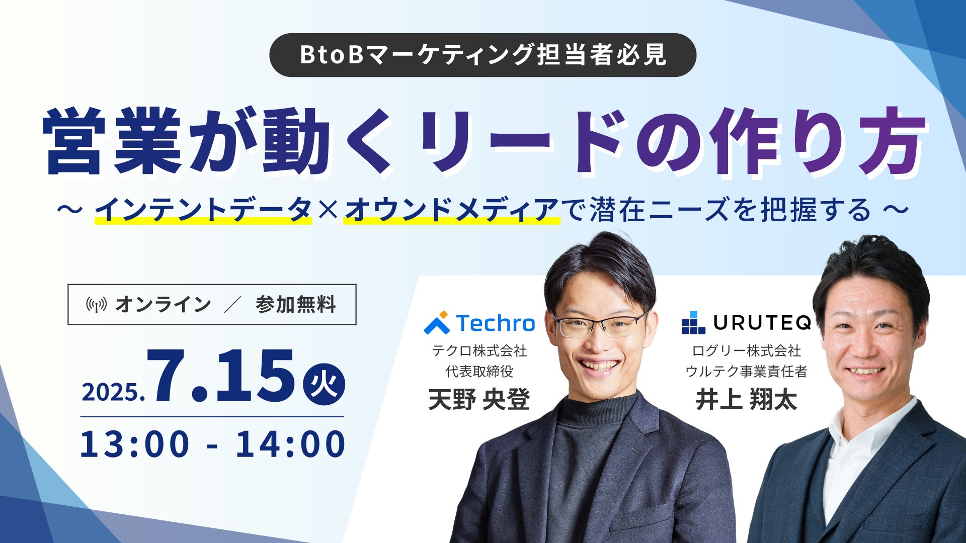 アカウントインテリジェンスツール※1『ウルテク』を提供するログリー株式会社とオウンドメディアやMA/SFAの導入運用支援を通してBtoB企業のWebマーケティングを支援するテクロ株式会社は、BtoB企業のマーケティング責任者/担当者向けに、「営業が動くリードの作り方 〜インテントデータ×オウンドメディアで潜在ニーズを把握する〜」というテーマの無料のオンラインウェビナーを開催します。