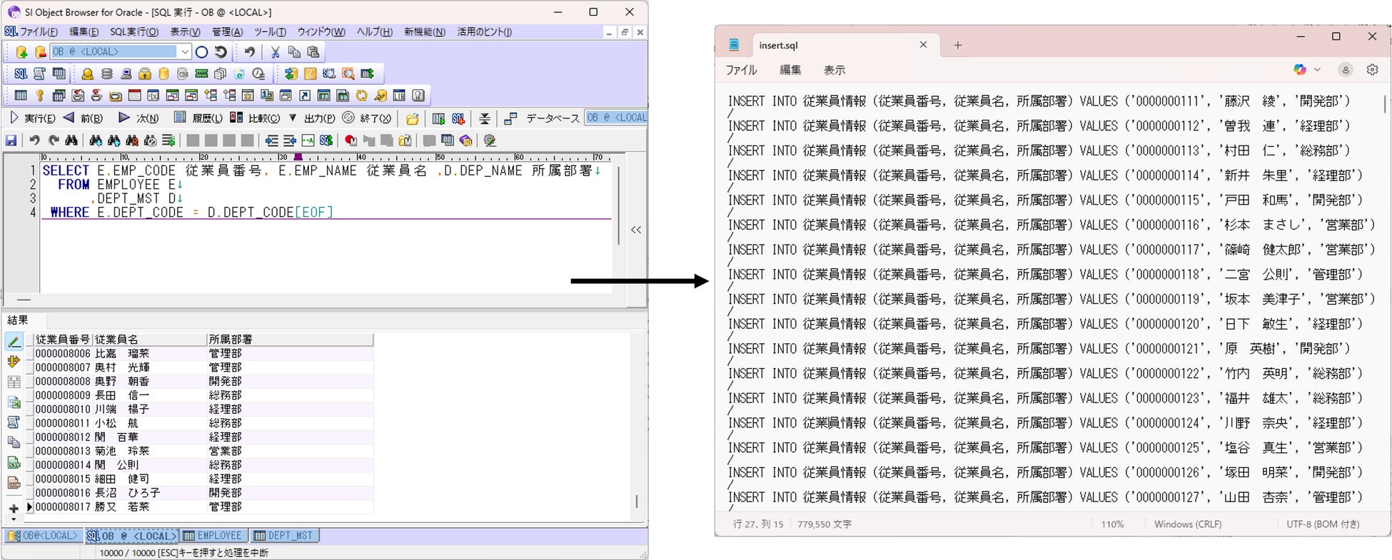 テーブルやSQL実行画面に表示されたテーブルデータをもとにINSERT文を生成可能にしました。従来のバージョンでもスクリプト出力機能でINSERT文が生成可能でしたが、本機能ではデータを絞り込んだ状態や、複数テーブルを結合したデータをINSERT文として生成でき、データ移行などの業務がより柔軟に行えるようになります。